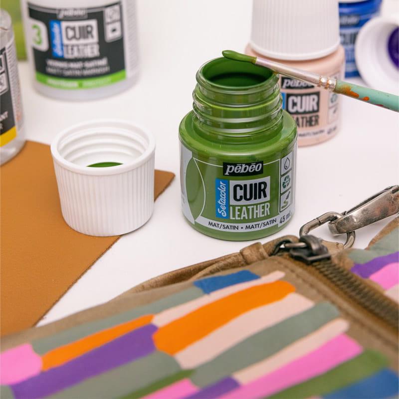 Farby Pebeo Setacolor Leather to gama satynowo-matowych farb do skóry, które mają wysoką odporność na zarysowania i zgięcia. Farby powinno się nakładać, cienkimi warstwami (producent zaleca maksymalnie 3 warstwy i odczekanie minimum 15 min między warstwami). Setacolor Leather mają doskonałe krycie.