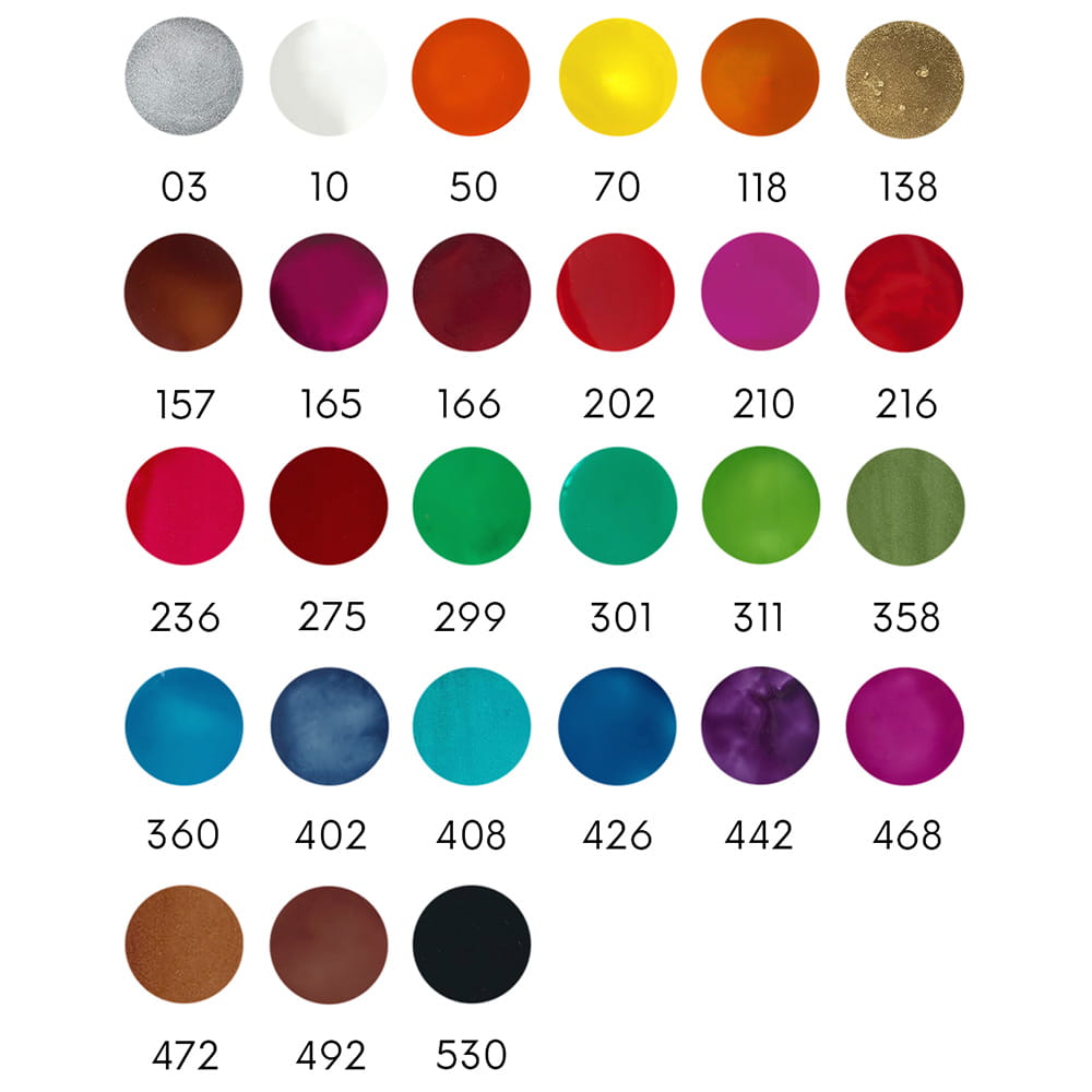 Farba do szkła na bazie rozpuszczalnika. Do użycia we wszystkich technikach dekorowania szkła. W palecie dostępne są 23 kolory, zapewniające efekt witrażu oraz 4 kryjące (biały, czarny, srebrny, złoty). Biała i czarna mogą być używane jako samodzielne kolory, można także mieszać je z kolorami transparentnymi, zmniejszając ich przejrzystość. Farby są odporne na działania światła i zmiany temperatur.