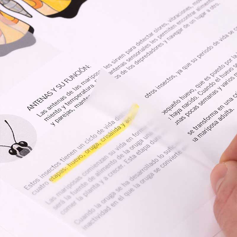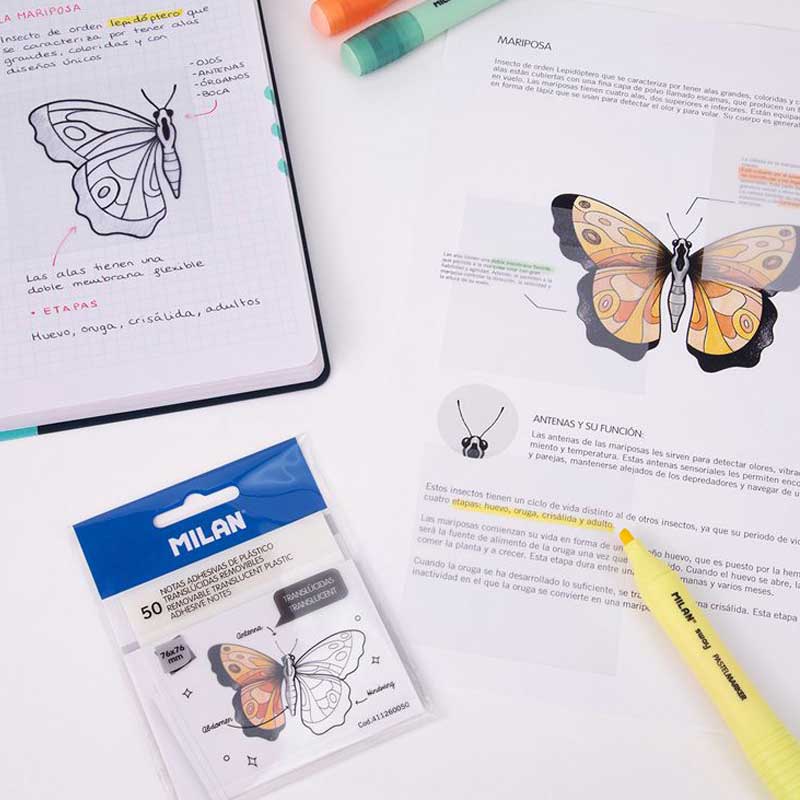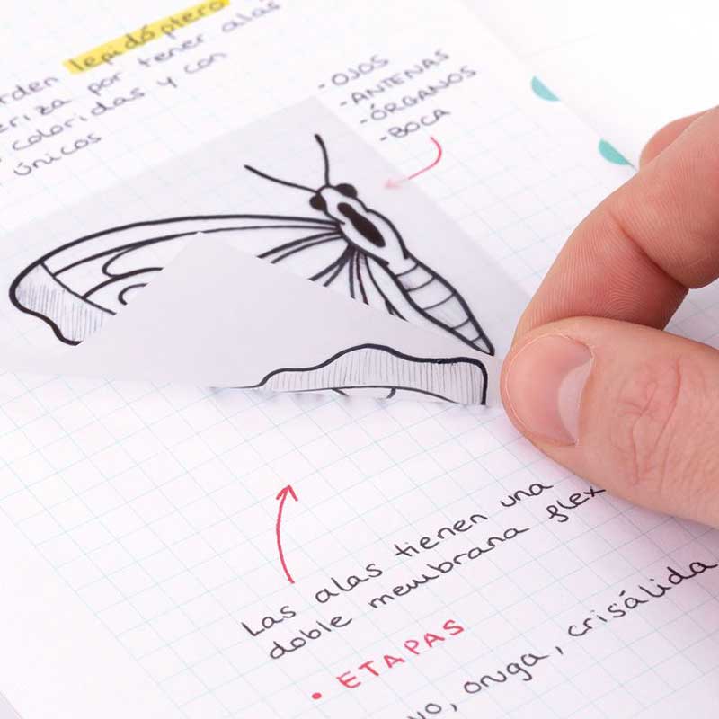 Karteczki z transparentnego tworzywa, przypominającego właściwościami kalkę. Tak jak standardowe karteczki samoprzylepne umożliwiają tworzenie notatek. Dodatkowo dzięki transparentności powłoki pozwalają na przerysowywanie kształtów obrazka oraz podkreślanie ważnych elementów tekstu, bez konieczności mazania po papierze zeszytu lub książki. Można ich także użyć w roli zakładek indeksujących lub znaczników w zeszycie. Bloczek zawiera 50 karteczek z samoprzylepnym paskiem w rozmiarze 76x76 mm. Do wielokrotnego użytku, dobrze trzymają się powierzchni papieru.