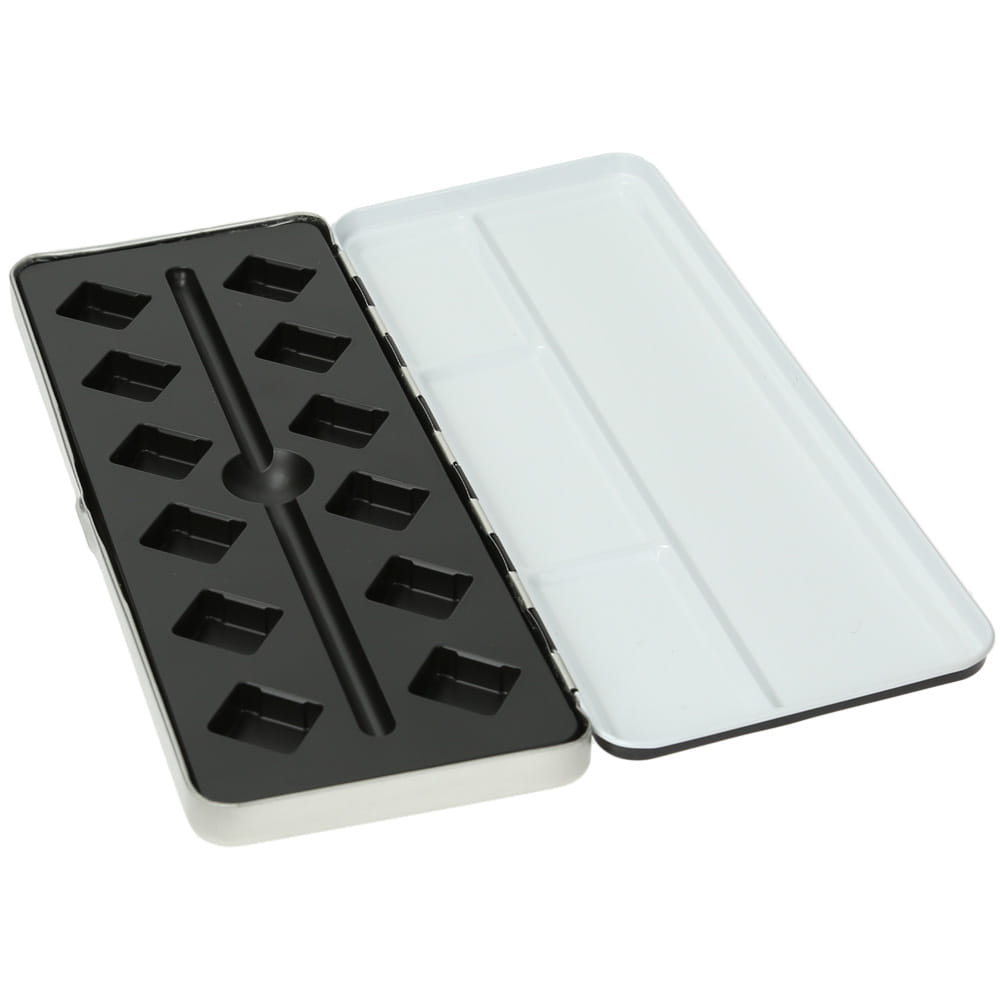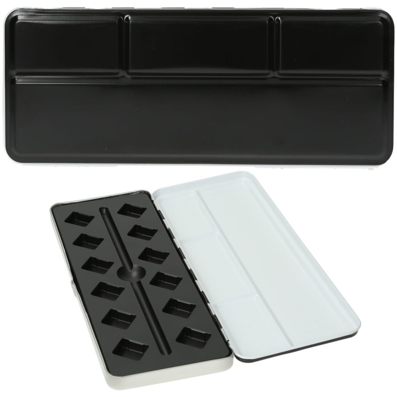 Profesjonalna, zamykana, metalowa kaseta na akwarele w półkostkach od firmy Renesans. Doskonała opcja dla artystów, którzy lubią komponować własne gamy kolorystyczne farb akwarelowych. Posiada wkładkę z tworzywa na farby oraz pędzel. Od zewnętrznej strony pokryta czarną farbą. Kasetka jest wygodna, mieści się w plecaku lub torebce, można zabrać ją w plener. Mieści 12 akwarelowych półkostek.
