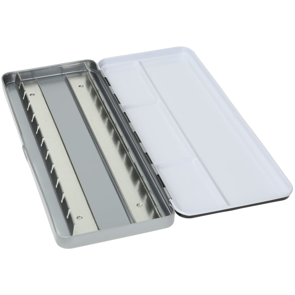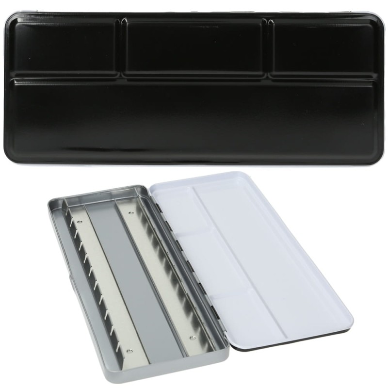 Zamykana, metalowa kaseta na akwarele w półkostkach. Doskonała opcja dla artystów, którzy lubią komponować własne gamy kolorystyczne farb akwarelowych. Od zewnętrznej strony pokryta czarną farbą. Kasetka jest wygodna, mieści się w plecaku lub torebce, można zabrać ją w plener. Mieści 24 akwarelowe półkostki.