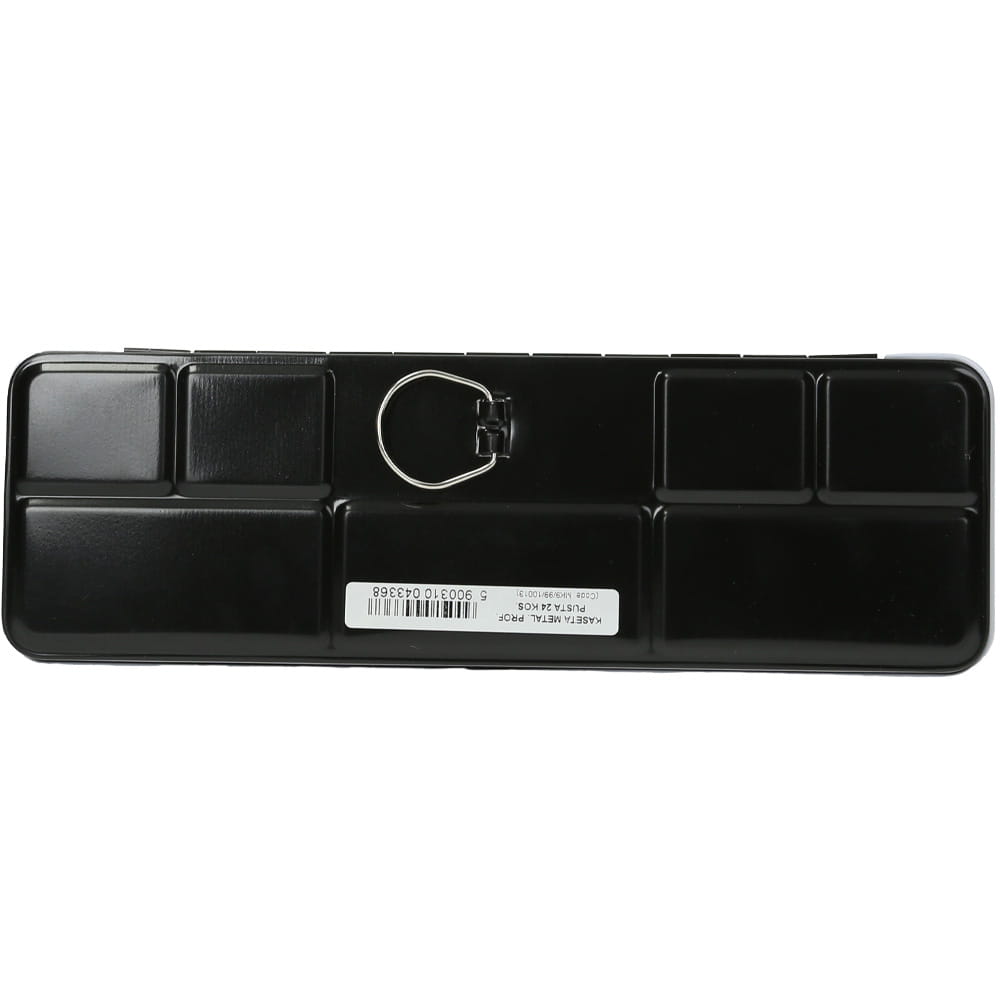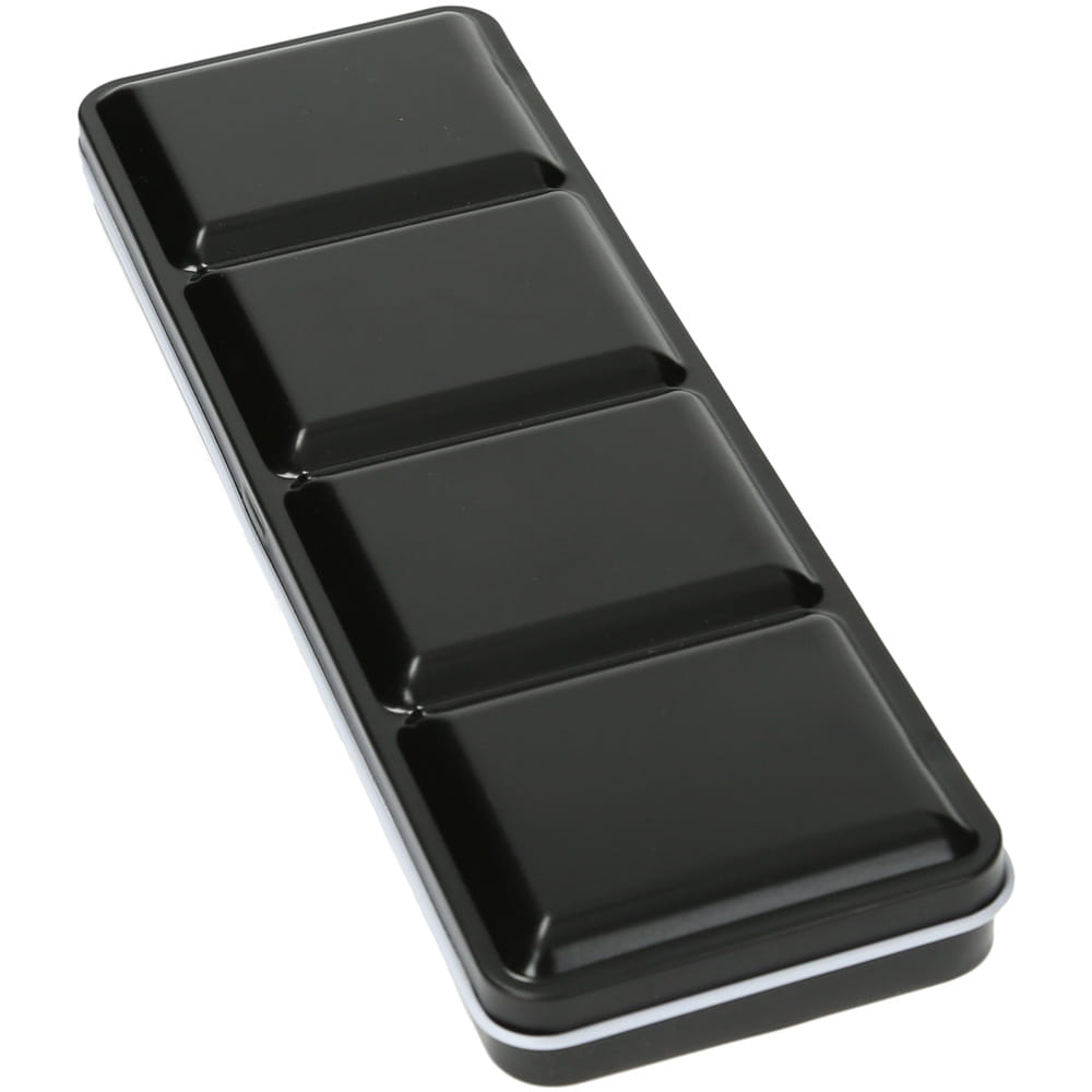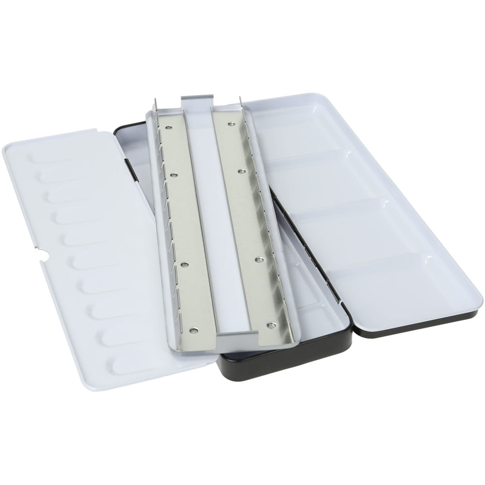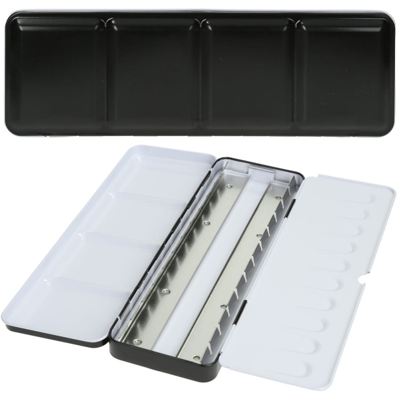 Profesjonalna, zamykana, metalowa kaseta na akwarele w półkostkach od firmy Renesans. Doskonała opcja dla artystów, którzy lubią komponować własne gamy kolorystyczne farb akwarelowych. Od zewnętrznej strony pokryta czarną farbą. Otwierane wieczko służy jako paletka do mieszania kolorów. Wnętrze kasetki jest wyjmowane, co ułatwia czyszczenie i wymianę farb. Kasetka jest wygodna, mieści się w plecaku lub torebce, można zabrać ją w plener. Uniwersalna wielkość przegródek sprawia, że w kasecie można przetrzymywać kostki akwarele od różnych producentów będących w asortymencie sklepu. Mieści 24 akwarelowe półkostki.