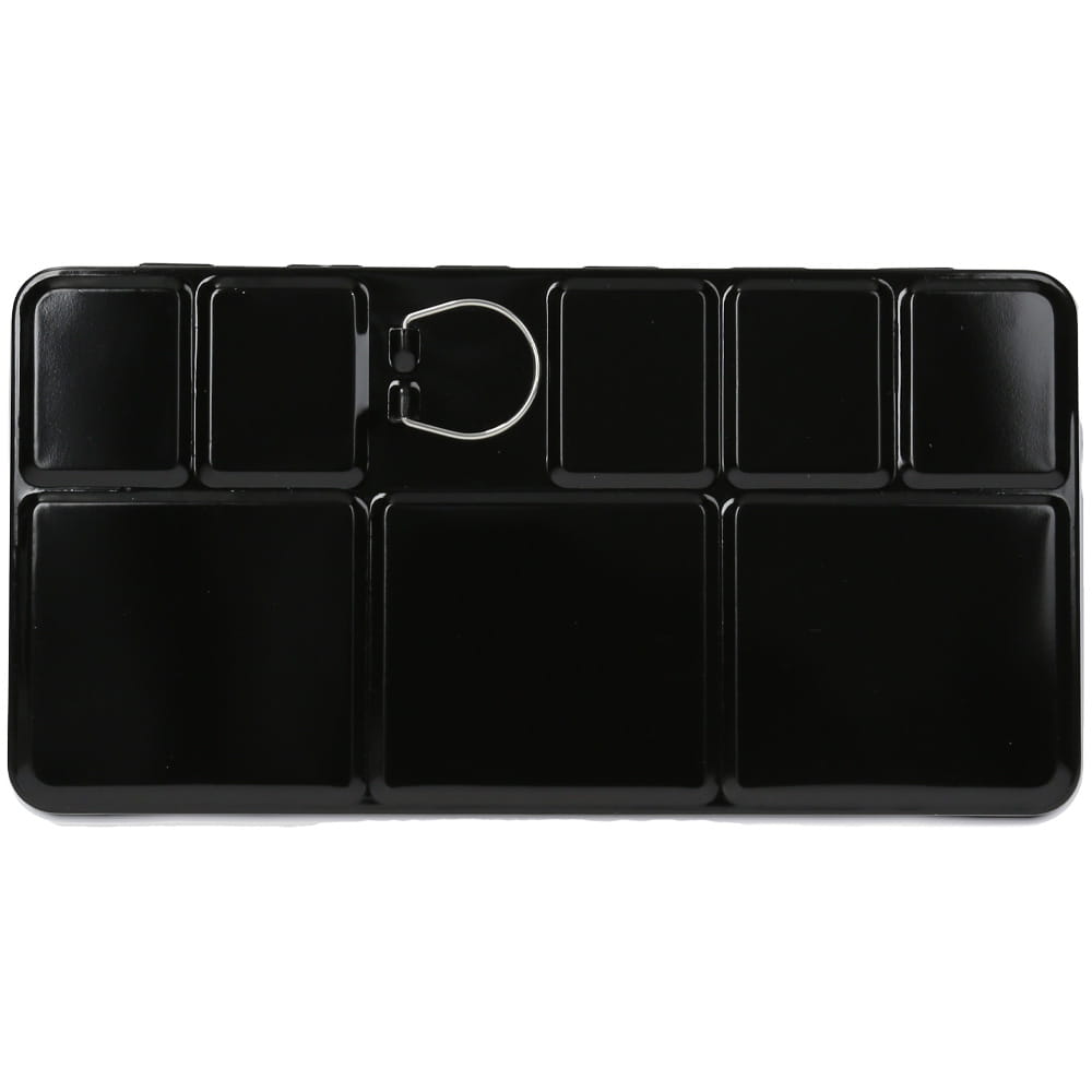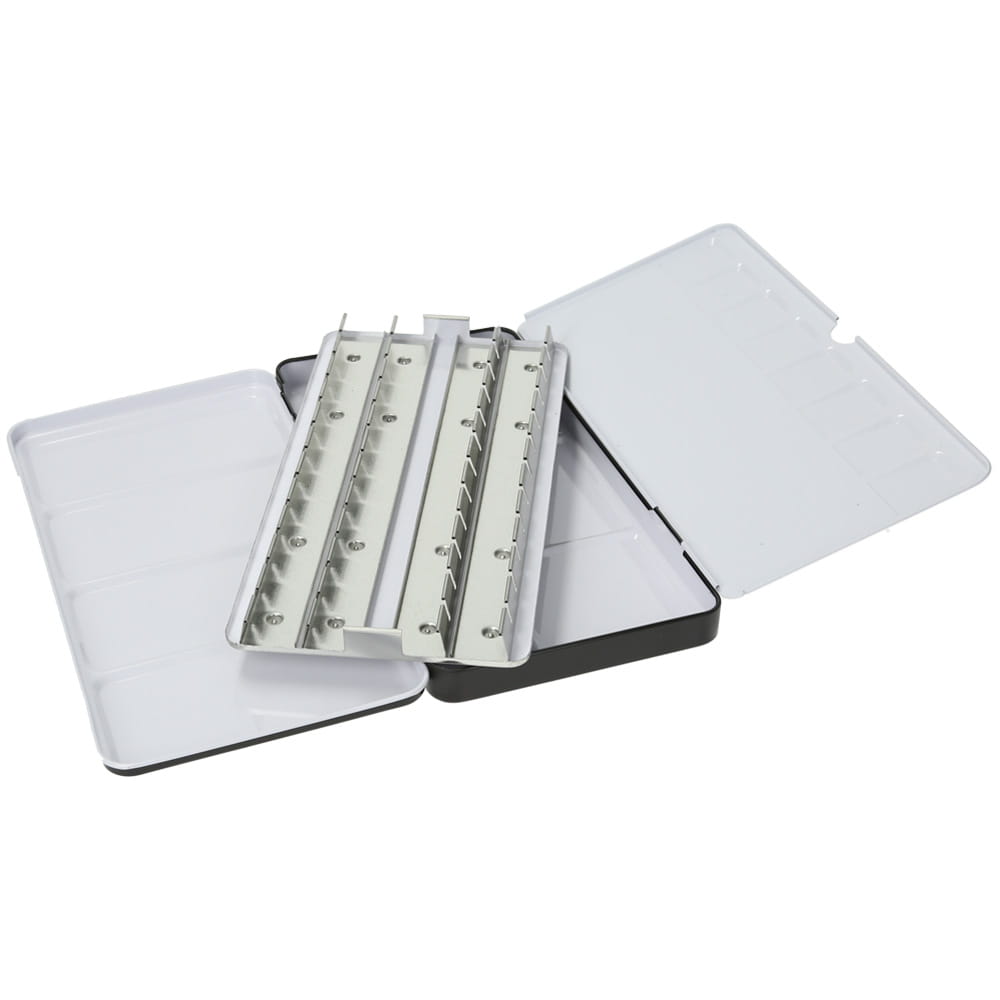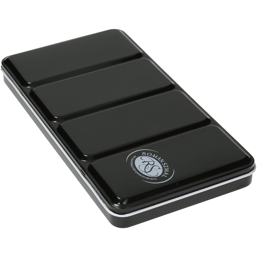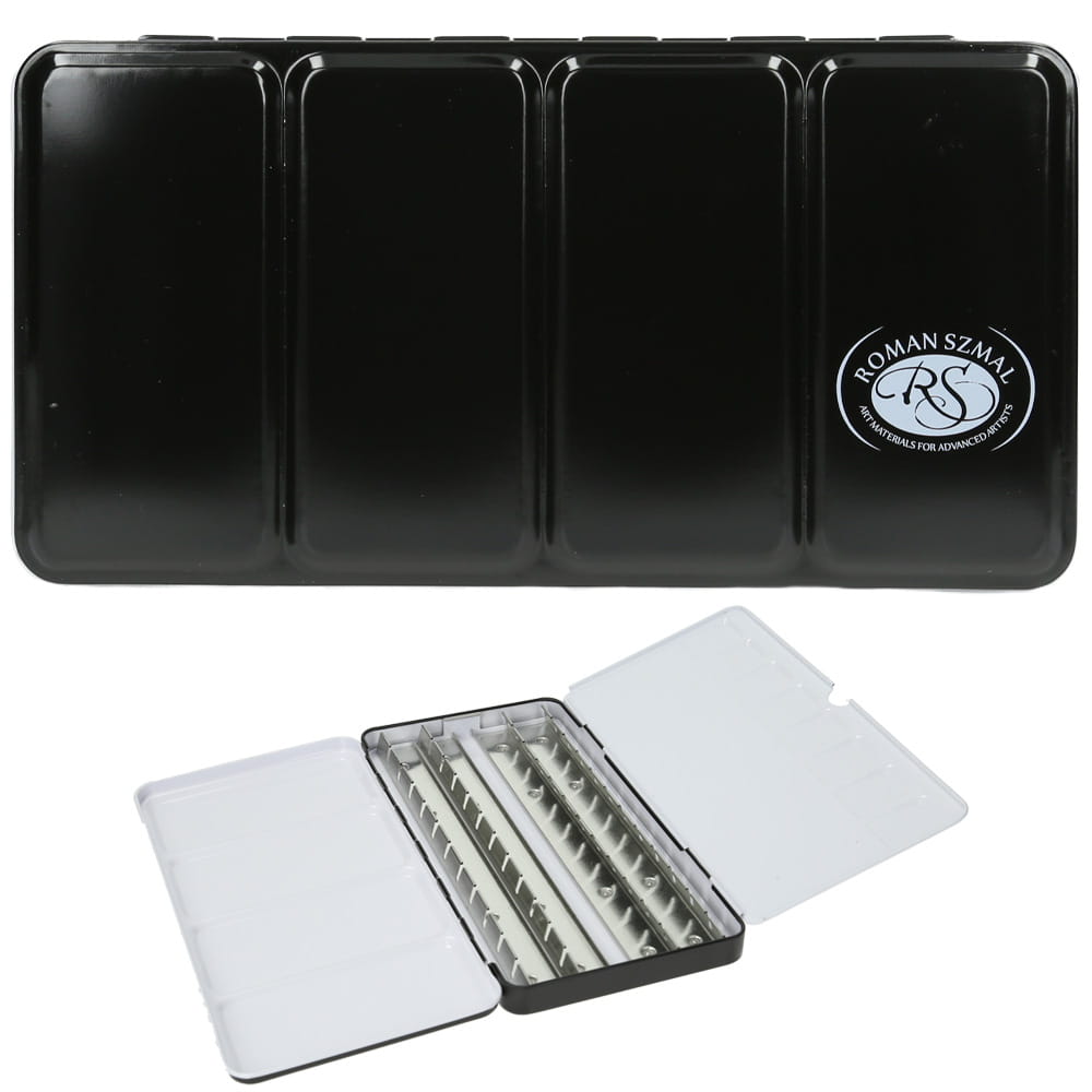 Kasetka metalowa Roman Szmal to uniwersalne i trwałe wyposażenie każdego akwarelisty. Wykonana z wysokiej jakości materiałów, pokryta z zewnątrz czarną, satynową farbą. Świetnie sprawdzi się artystom nie lubiącym zabierać ze sobą ciężkiego bagażu w plener. Z łatwością mieści się do kieszeni plecaka lub torebki. Posiada wymienną część wewnętrzną pozwalającą na umieszczenie kostek lub pół kostek farb. Wieczko po otwarciu spełnia rolę paletki malarskiej dzięki specjalnie wytłoczonych w nim zagłębieniach. Z tyłu kasetki znajduje się poręczny uchwyt na palec.