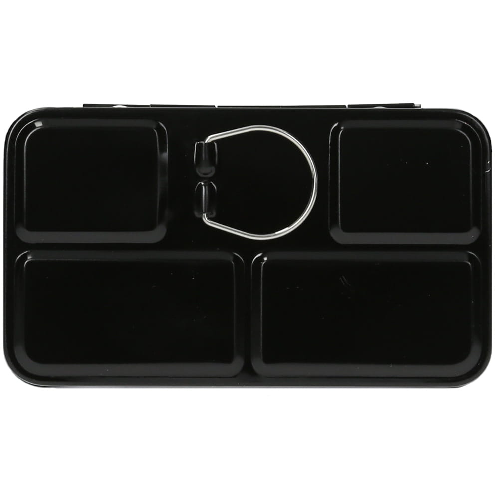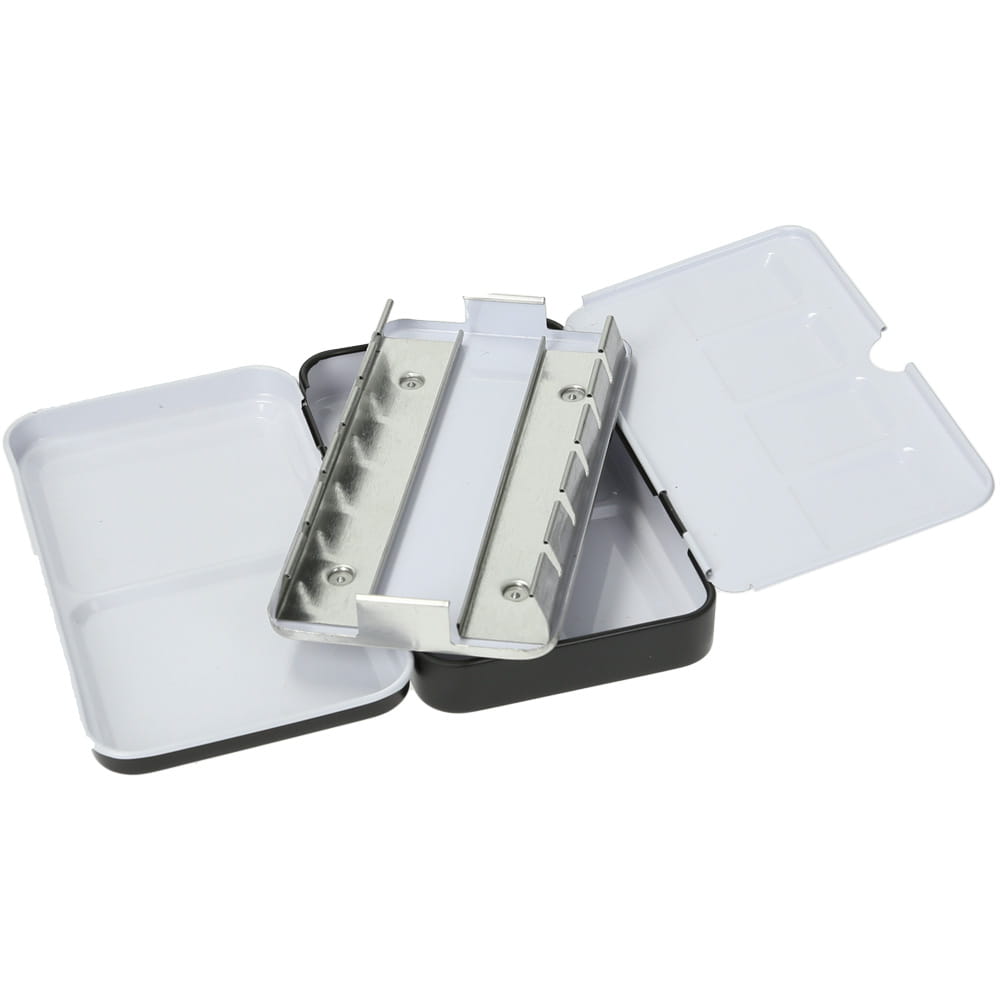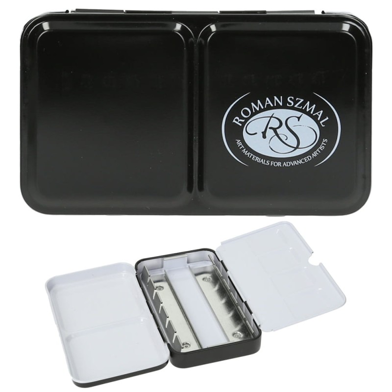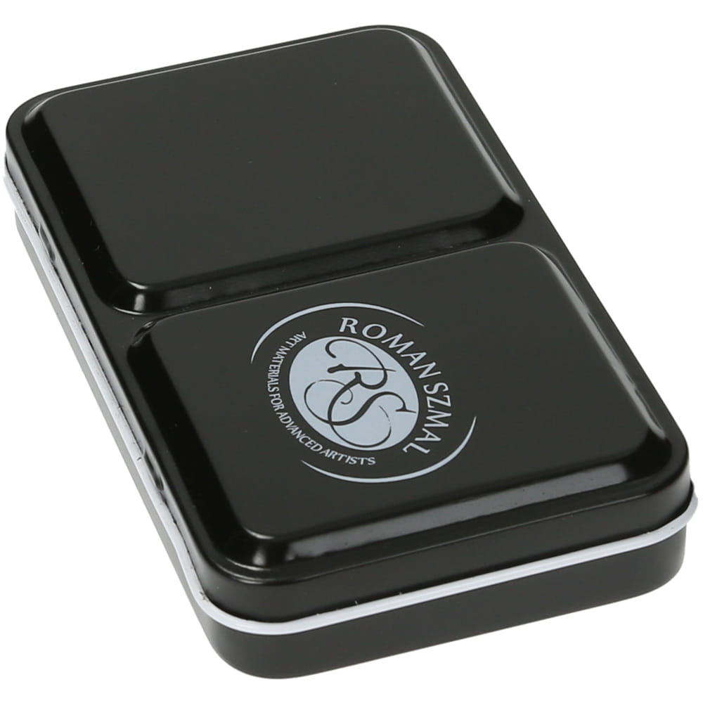 Kasetka metalowa Roman Szmal to uniwersalne i trwałe wyposażenie każdego akwarelisty. Wykonana z wysokiej jakości materiałów, pokryta z zewnątrz czarną, satynową farbą. Świetnie sprawdzi się artystom nie lubiącym zabierać ze sobą ciężkiego bagażu w plener. Z łatwością mieści się do kieszeni plecaka lub torebki. Posiada wymienną część wewnętrzną pozwalającą na umieszczenie kostek lub pół kostek farb. Wieczko po otwarciu spełnia rolę paletki malarskiej dzięki specjalnie wytłoczonych w nim zagłębieniach. Z tyłu kasetki znajduje się poręczny uchwyt na palec.