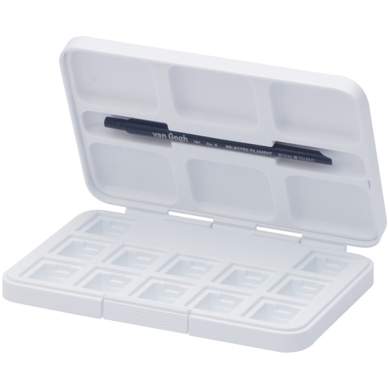 Solidne, zamykane opakowanie na akwarele to idealny produkt dla artystów lubiących samodzielnie komponować paletę barw. Kasetka jest wygodna, ma kieszonkowy rozmiar i z łatwością zmieści się w plecaku czy torebce. Można zabrać ją ze sobą wszędzie i tworzyć wspaniałe plenery. Kaseta zawiera chowany pędzel oraz paletkę do mieszania farb z 6 otworami. Otwierane wieczko pełni rolę paletki malarskiej. Kasetka mieści 12 kostek farb. Kolor biały.