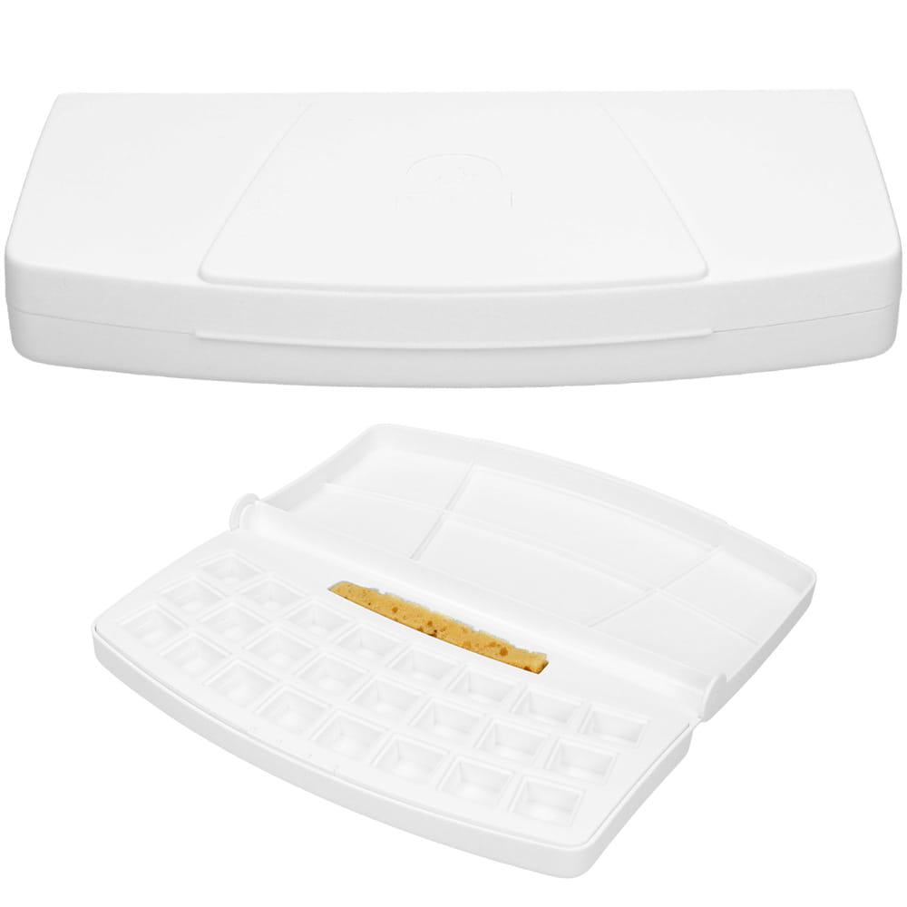 Solidne, zamykane opakowanie na akwarele to idealny produkt dla artystów lubiących samodzielnie komponować paletę barw. Kasetka jest wygodna i z łatwością zmieści się w plecaku czy torebce. Można zabrać ją ze sobą wszędzie i tworzyć wspaniałe plenery. Kaseta zawiera gąbeczkę do szybkiego czyszczenia pędzli. Otwierane wieczko pełni rolę paletki malarskiej. Kasetka mieści 24 kostki farb.