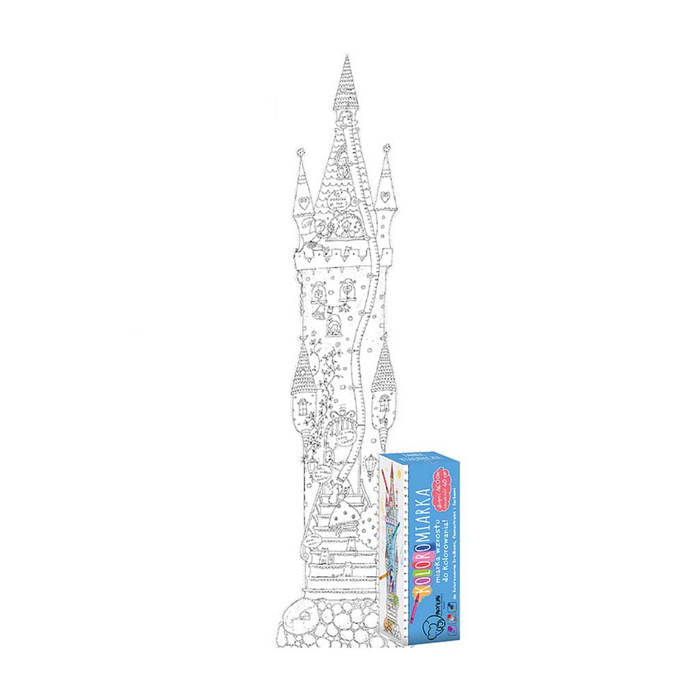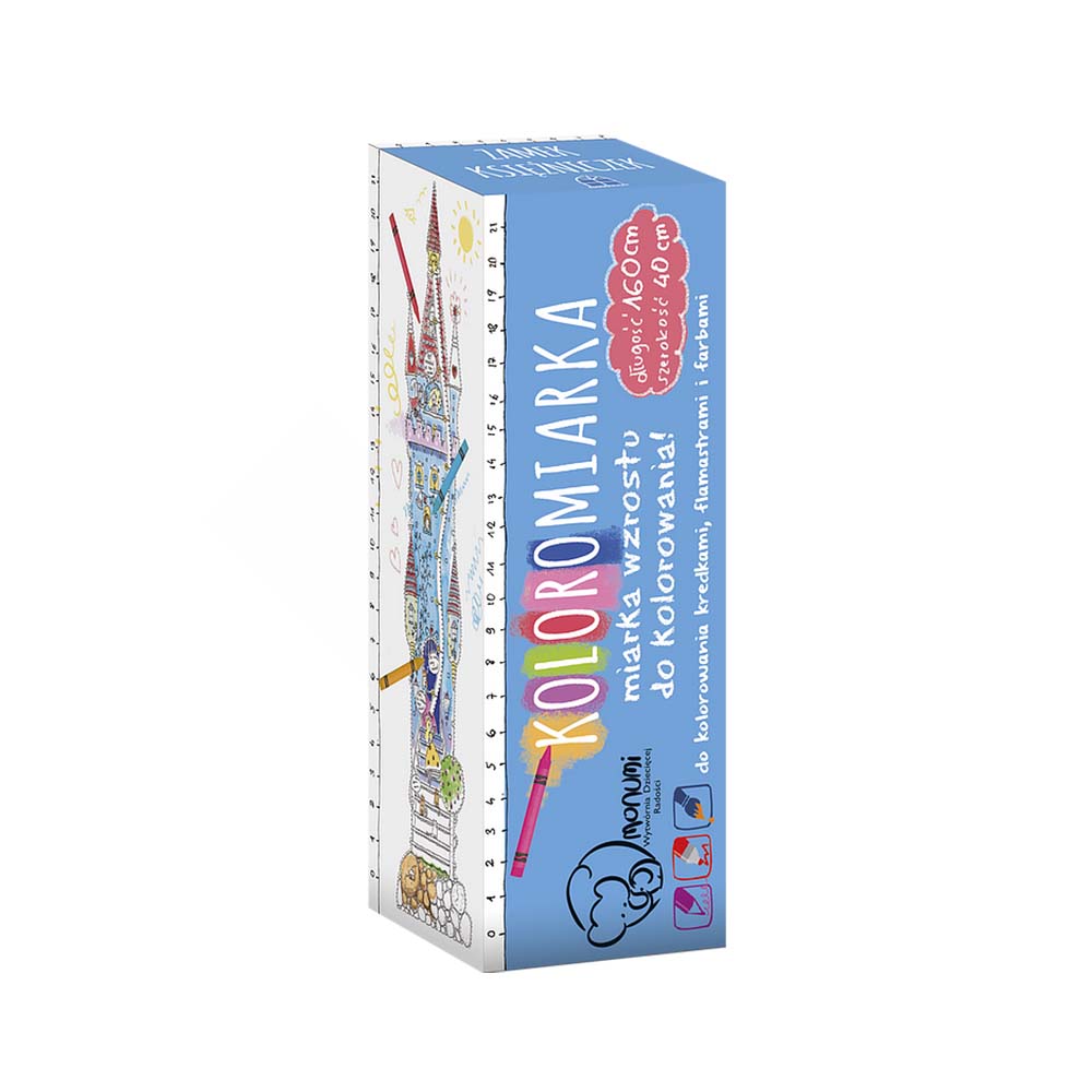 Podłużny plakat do kolorowania z miarką wzrostu. Do przyklejenia na ścianie. Wykonany z grubego, białego kartonu. Profesjonalna grafika, wyraźny, czarny druk. Rolowany, nie składany – bez zagnieceń. W tekturowej tubie chroniącej przed zniszczeniem. Odpowiedni do kolorowania kredkami, flamastrami, markerami i farbami. Karton dobrze absorbuje wilgoć. Dzięki specjalnej warstwie spodniej nie fałduje się i nie przecieka.