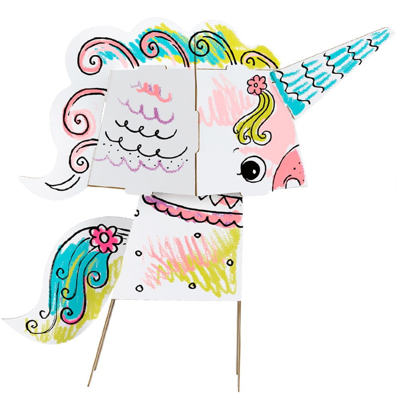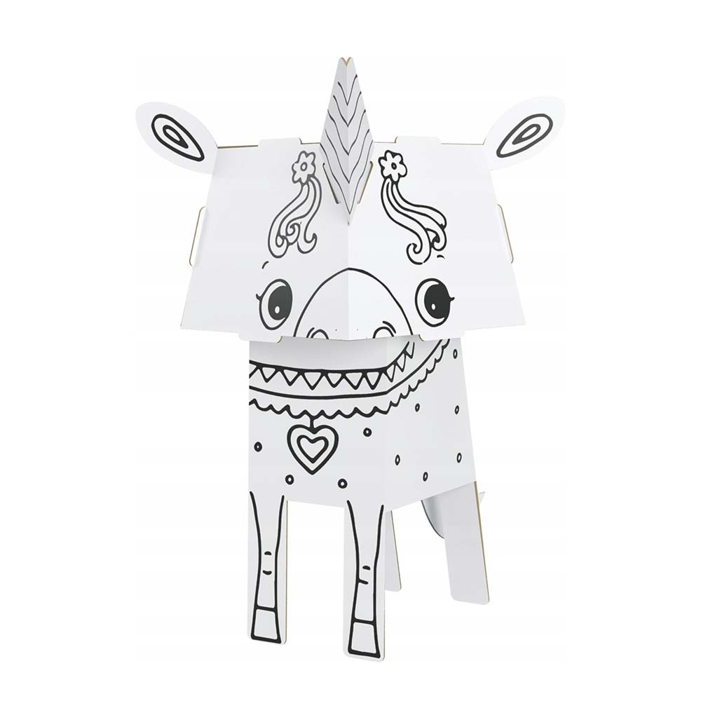Przestrzenny, mały model jednorożca z dużą głową do pokolorowania. Wykonany z białego kartonu. Precyzyjnie wycięte elementy, łatwe do złożenia bez kleju i nożyczek. Obrazkowa instrukcja z tyłu opakowania. Złożony model jest wytrzymały, stabilny i lekki. Profesjonalna grafika, czarny druk. Odpowiednia do kolorowania kredkami, markerami, flamastrami i farbami. Karton dobrze absorbuje wilgoć, nie fałduje się i nie przecieka.