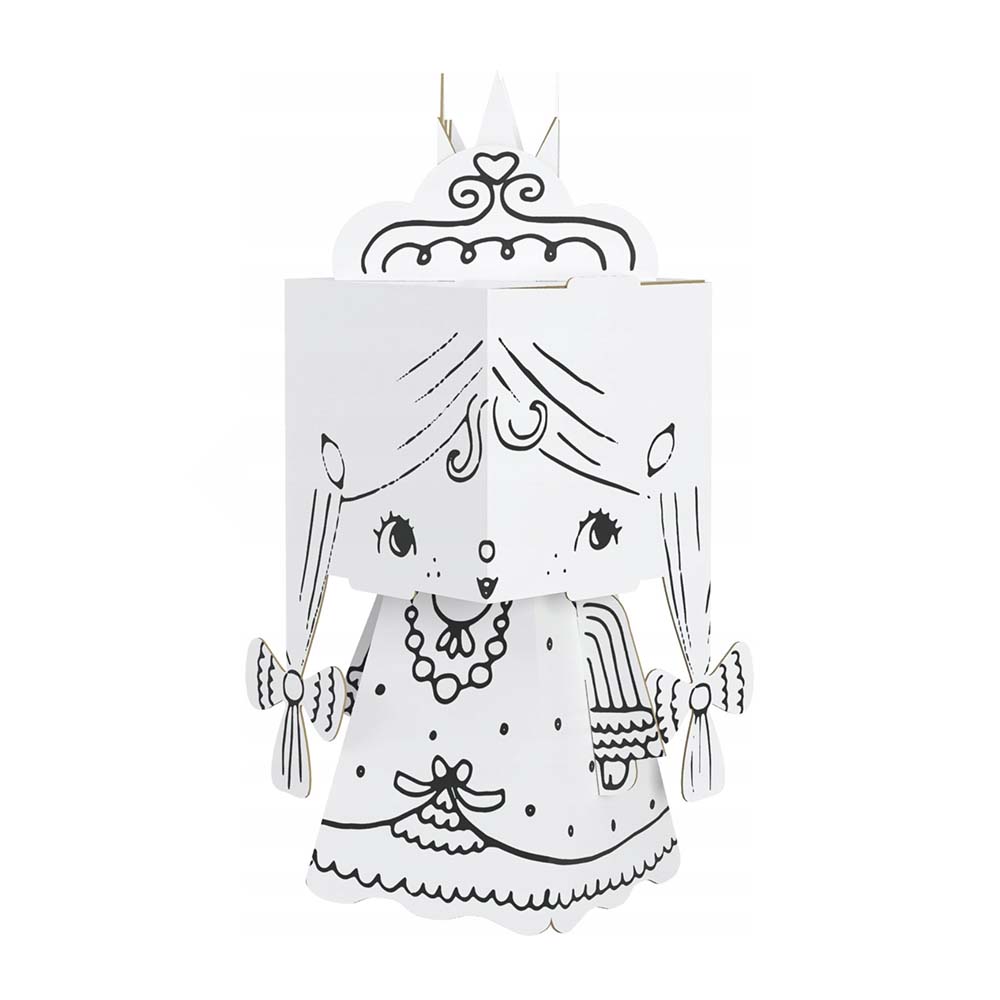 Przestrzenny, mały model księżniczki z dużą głową do pokolorowania. Wykonany z białego kartonu. Precyzyjnie wycięte elementy, łatwe do złożenia bez kleju i nożyczek. Obrazkowa instrukcja z tyłu opakowania. Złożony model jest wytrzymały, stabilny i lekki. Profesjonalna grafika, czarny druk. Odpowiednia do kolorowania kredkami, markerami, flamastrami i farbami. Karton dobrze absorbuje wilgoć, nie fałduje się i nie przecieka.
