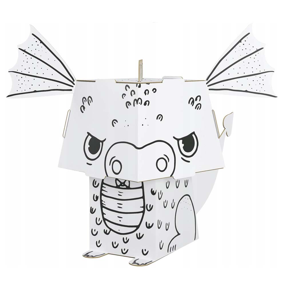 Przestrzenny, mały model smoka z dużą głową do pokolorowania. Wykonany z białego kartonu. Precyzyjnie wycięte elementy, łatwe do złożenia bez kleju i nożyczek. Obrazkowa instrukcja z tyłu opakowania. Złożony model jest wytrzymały, stabilny i lekki. Profesjonalna grafika, czarny druk. Odpowiednia do kolorowania kredkami, markerami, flamastrami i farbami. Karton dobrze absorbuje wilgoć, nie fałduje się i nie przecieka.