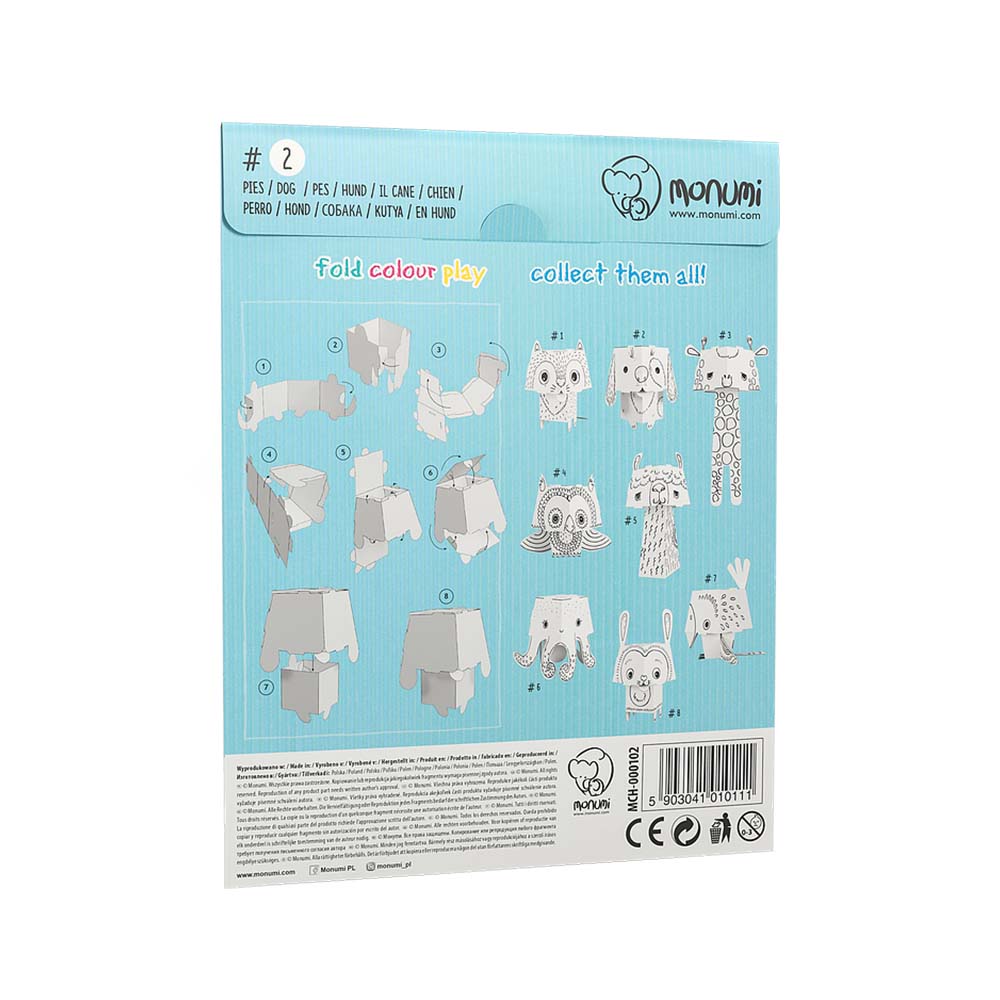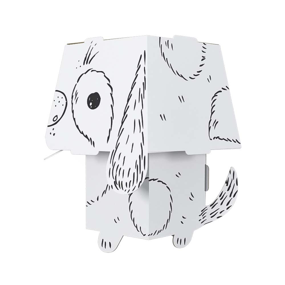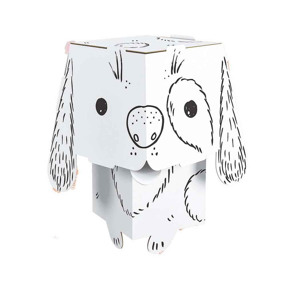 Przestrzenny, mały model zwierzaka z dużą głową do pokolorowania. Wykonany z białego kartonu. Precyzyjnie wycięte elementy, łatwe do złożenia bez kleju i nożyczek. Obrazkowa instrukcja z tyłu opakowania. Złożony model jest wytrzymały, stabilny i lekki. Profesjonalna grafika, czarny druk. Odpowiednia do kolorowania kredkami, markerami, flamastrami i farbami. Karton dobrze absorbuje wilgoć, nie fałduje się i nie przecieka.