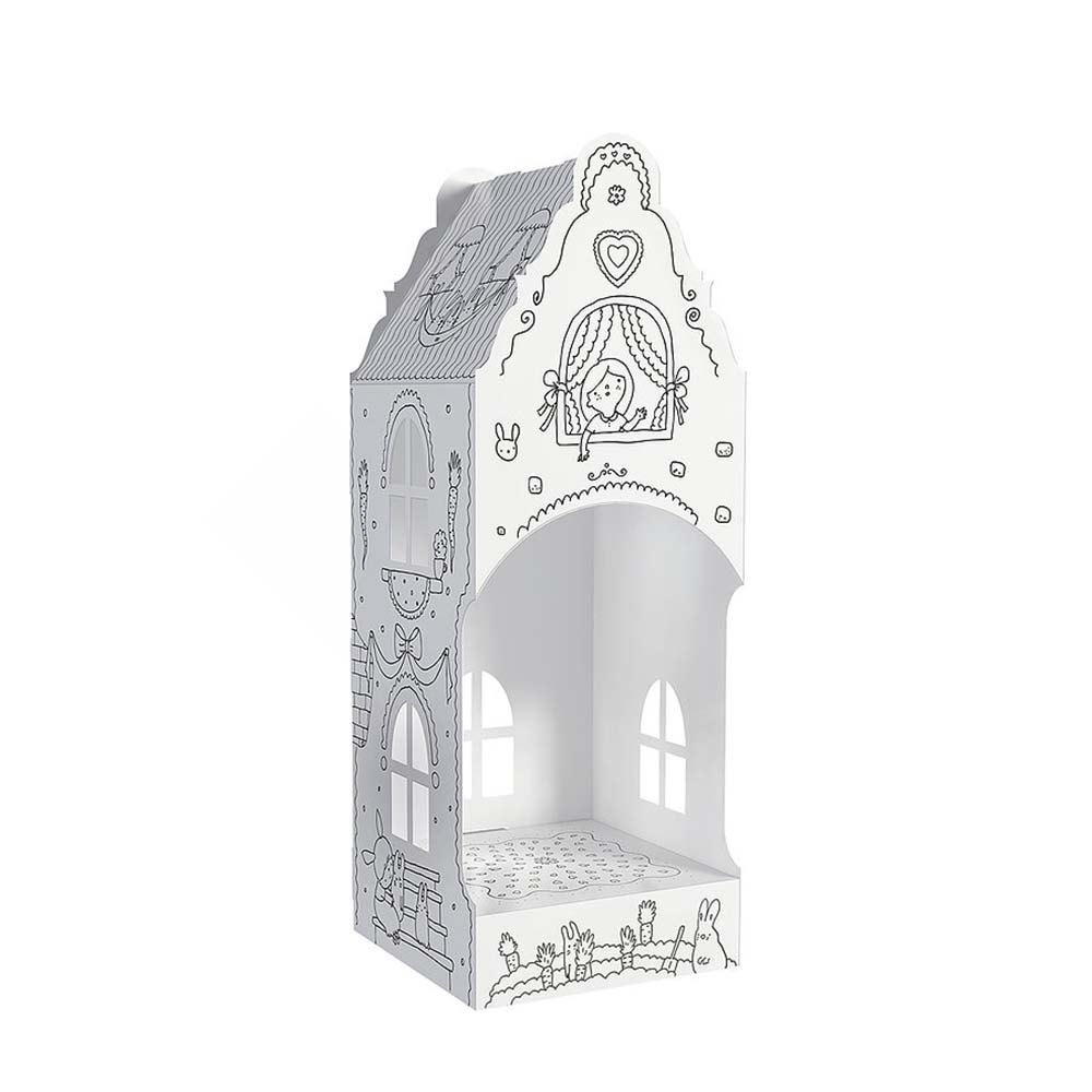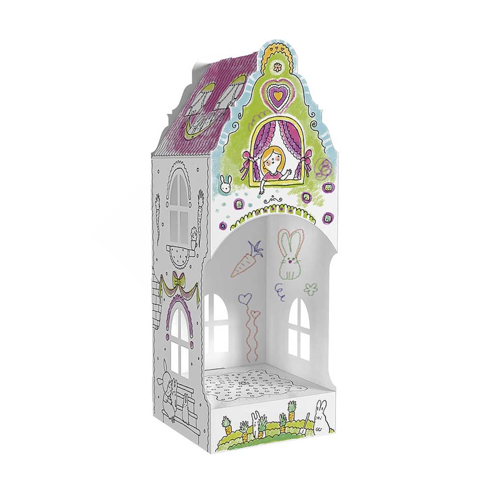 Przestrzenny domek-kolorowanka wykonany został z białego, wytrzymałego kartonu. Duże, precyzyjnie wycięte elementy, które są łatwe do złożenia bez kleju i nożyczek. Obrazkowa instrukcja z tyłu opakowania. Ruchome części, otwarte przestrzenie, okienka i półeczki uatrakcyjniają zabawkę. Złożona konstrukcja jest wytrzymała, stabilna i lekka. Profesjonalna grafika oraz wyraźny, czarny druk. Odpowiednia do kolorowania kredkami, markerami, flamastrami i farbami. Karton dobrze absorbuje wilgoć, nie fałduje się i nie przecieka.