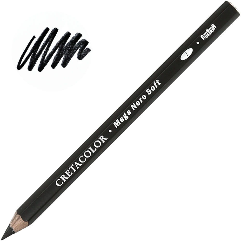 Seria Cretacolor Mega Nero zawiera trzy twardości kredek, soft, medium, hard. Gradacja umożliwia na uzyskanie doskonałych efektów cieniowania w monochromatycznym rysunku. Dodatkowo nasycenie koloru i intensywność stopniować można przez nacisk. Gruba kredka o średnicy 10 mm i grubości grafitu 5,5 mm, jest wygodna w użyciu i dobrze się trzyma w palcach. Satynowa, bogata czerń. Mega Nero Soft to najmiększa czerń z trzystopniowej gradacji kredek.