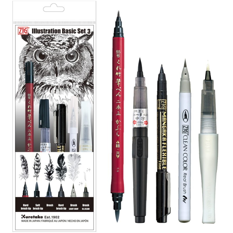 - Kuretake Fude Pen Koburi „Chuji” No. 32 - Pisak z końcówką pędzelkową z włosia nylonowego. Umożliwia uzyskanie linii o różnej grubości. Zawiera wodny, pigmentowy tusz w kolorze czarnym, po wyschnięciu odporny na działanie wody i światła. Znakomity do mangi, kaligrafii, tradycyjnego malarstwa sumi-e i innych technik.