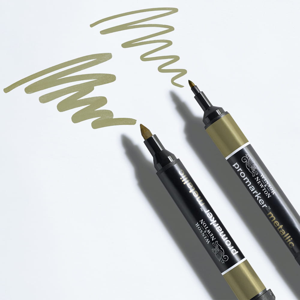 Markery Promarker Metallic mają intensywne i błyszczące kolory metaliczne. Idealne do tworzenia efektów, tekstur i wzorów. Tusz na bazie pigmentu o doskonałej odporności na światło, co pozwala osiągnąć trwałe rezultaty. Dobrze miesza się z wodą, tworząc dodatkowe efekty metaliczne. Markery mają dwie okrągłe końcówki: jedną szeroką, idealną do wypełniania dużych powierzchni, a drugą drobniejszą do detali.