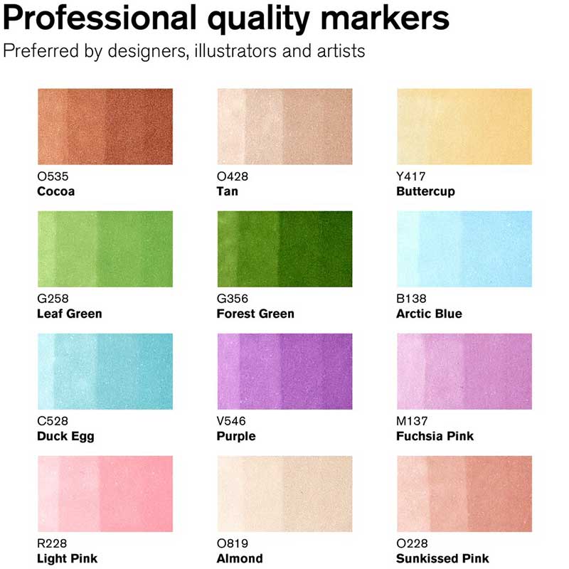 Komplet 12 Promarkerów zawiera 12 wyselekcjonowanych bazowych kolorów w wygodnym i prostym opakowaniu. Ten starannie dobrany zestaw kolorów zawiera również darmowy blender.
