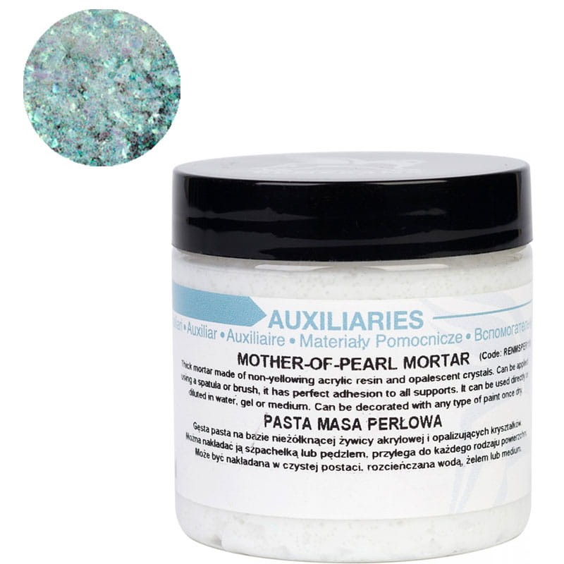 Gęsta pasta z opalizującymi kryształkami na bazie nieżółknącej żywicy akrylowej. Nakładanie pędzlem lub szpachelką. Przylega do każdego rodzaju powierzchni oraz może być rozcieńczana z wodą, medium lub żelem.