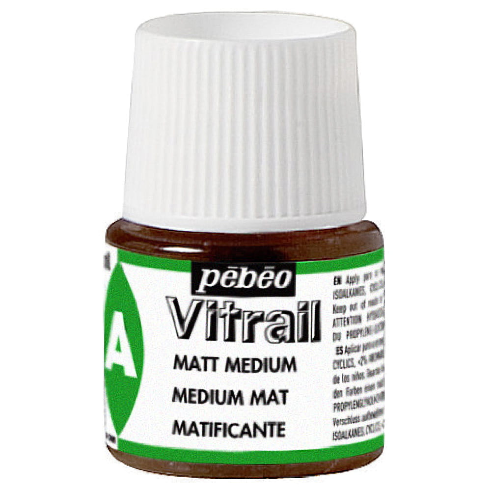 Medium matowe do farb Vitrail firmy Pebeo. Należy dodać do farby, aby uzyskać matowe wykończenie. Schnie wstępnie w ciągu 2 godz., całkowicie po 10 godz. UWAGA - łatwopalne opary. Należy używać w miejscu z dobrą wentylacją. Przechowywać w chłodnym miejscu, poza zasięgiem dzieci.