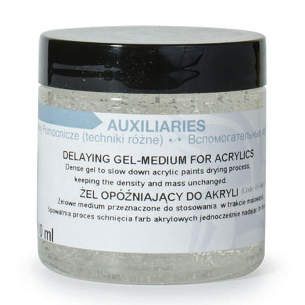 Żel opóźniający to medium spowalniające proces wysychania farb akrylowych w żelowej formie. Nie ma wpływu na lepkość farby i delikatnie zwiększa intensywność barwy. Należy dodawać w niewielkich proporcjach.