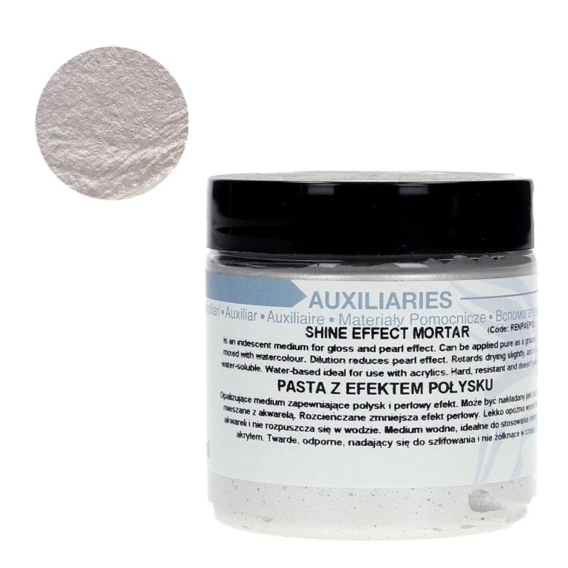 Pasta z efektem połysku to medium zapewniające idealny połysk z perłowym efektem. Może być nakładane jako baza lub mieszane z farbą wodną. Rozcieńczanie medium zmniejsza efekt perłowy, delikatnie opóźnia wysychanie i nie rozpuszcza się w wodzie. Idealne do stosowania również z farbami akrylowymi. Po wyschnięciu perłowa pasta jest twarda, odporna, może być szlifowana. Nie żółknie z czasem.