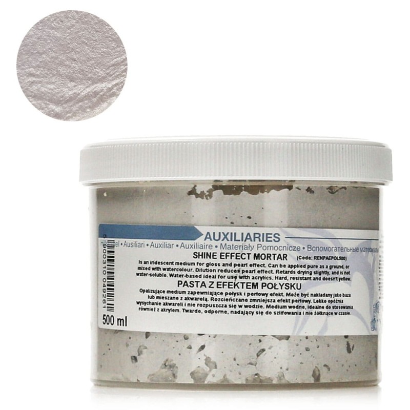 Pasta z efektem połysku to medium zapewniające idealny połysk z perłowym efektem. Może być nakładane jako baza lub mieszane z farbą wodną. Rozcieńczanie medium zmniejsza efekt perłowy, delikatnie opóźnia wysychanie i nie rozpuszcza się w wodzie. Idealne do stosowania również z farbami akrylowymi. Po wyschnięciu perłowa pasta jest twarda, odporna, może być szlifowana. Nie żółknie z czasem.