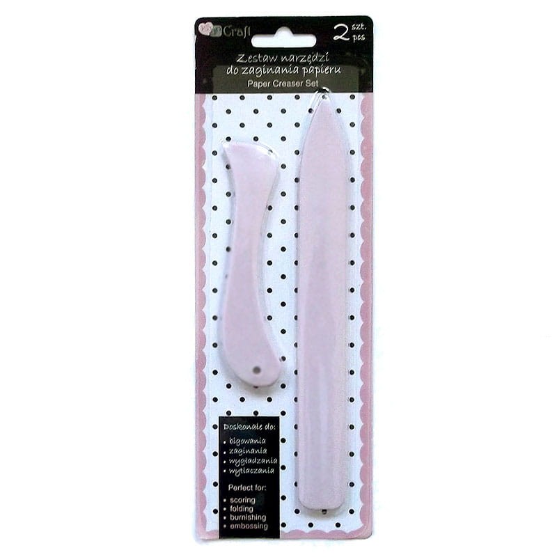 Zestaw dwóch narzędzi do zaginania papieru, wykonane z tworzywa sztucznego odpowiedniki kości introligatorskiej. Narzędzia do bigowania, zagniatania, wygładzania i wytłaczania papieru. Przydatne akcesorium do tworzenia projektów plastycznych z papieru, kopert, kartek okolicznościowych, projektów introligatorskich oraz wielu innych.