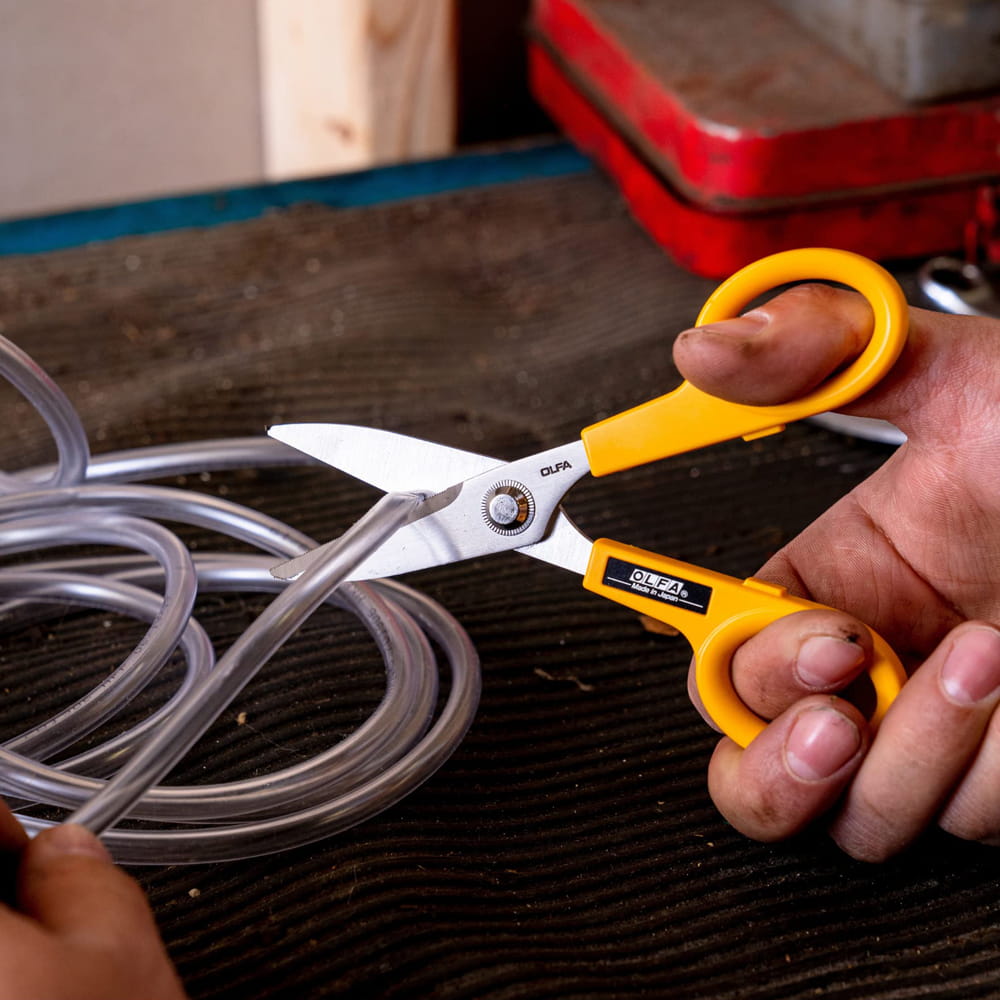 Wygodne, symetryczne ukształtowane rękojeści uformowane z wysokiej jakości tworzywa sztucznego (ABS) pozwala na używanie nożyczek przez osoby prawo i leworęczne, gwarantują wygodną pracę i ograniczają zmęczenie dłoni. Nożyczki OLFA tną niezwykle skutecznie zarówno cienkie i wiotkie materiały (bibuła, cienkie tkaniny, folie) jak też grube i sztywne (karton, tekturę, tkaniny techniczne, cienkie arkusze tworzyw sztucznych), a także sznury, liny, węże gumowe i igelitowe, a nawet cienkie przewody elektryczne. Szczególnie wygodne do precyzyjnego cięcia drobnych detali.