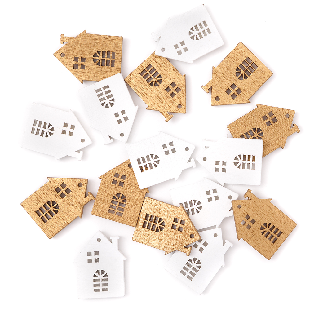 Drewniane domki samoprzylepne to doskonałe uzupełnienie kreatywnych prac świątecznych i zimowych. Z jednej strony każdego domku umieszczono okrągłą naklejkę piankową, dzięki której można łatwo i szybko zamocować domek na różnych powierzchniach. Domki złote pomalowano delikatnie połyskującą farbą metaliczną.
