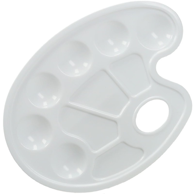 Owalna paleta malarska wykonana z trwałego tworzywa sztucznego. Posiada 10 wgłębień na farby oraz specjalnie wyprofilowany otwór na palec. Wygodna i komfortowa w użyciu. Idealna do farb akrylowych, temper oraz akwareli.