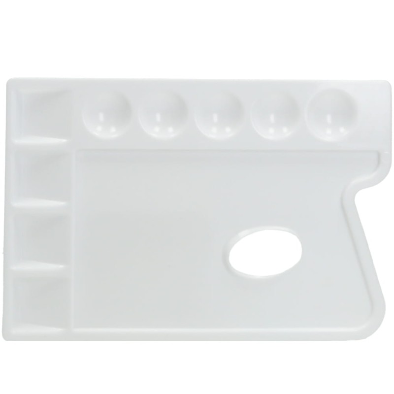 Prostokątna paleta malarska wykonana z trwałego tworzywa sztucznego. Posiada 10 wgłębień na farby oraz specjalnie wyprofilowany otwór na palec. Wygodna i komfortowa w użyciu. Idealna do farb akrylowych, temper oraz akwareli.