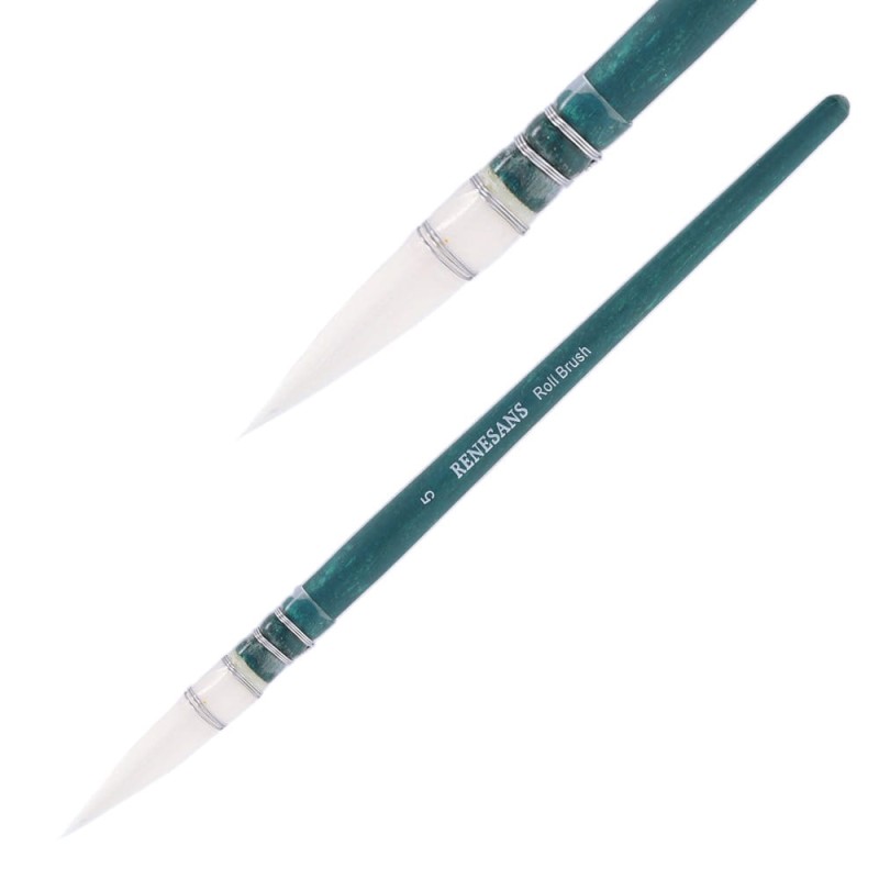Roll Brush posiada białe, okrągłe, nylonowe włosie typu MOP. Jest miękkie i sprężyste co sprawia, że bardzo dobrze nadaje się do farb akwarelowych. Magazynują duże ilości farby, pozwalając na malowanie precyzyjnych linii. Trzonki są krótkie, drewniane, barwione na turkusowo.