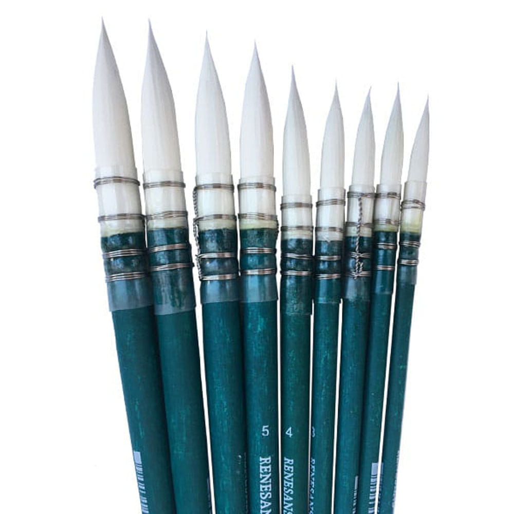 Roll Brush posiada białe, okrągłe, nylonowe włosie typu MOP. Jest miękkie i sprężyste co sprawia, że bardzo dobrze nadaje się do farb akwarelowych. Magazynują duże ilości farby, pozwalając na malowanie precyzyjnych linii. Trzonki są krótkie, drewniane, barwione na turkusowo.
