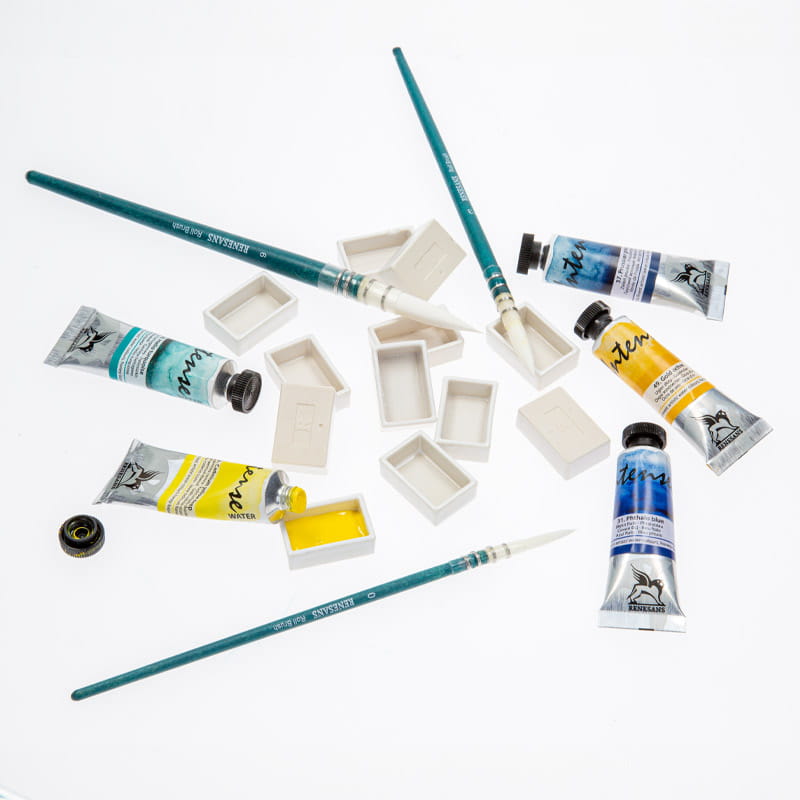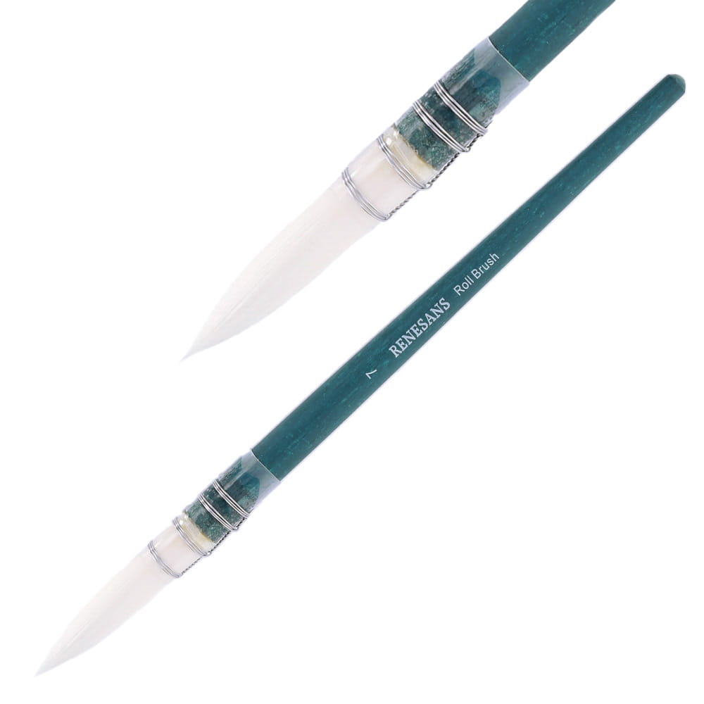 Roll Brush posiada białe, okrągłe, nylonowe włosie typu MOP. Jest miękkie i sprężyste co sprawia, że bardzo dobrze nadaje się do farb akwarelowych. Magazynują duże ilości farby, pozwalając na malowanie precyzyjnych linii. Trzonki są krótkie, drewniane, barwione na turkusowo.