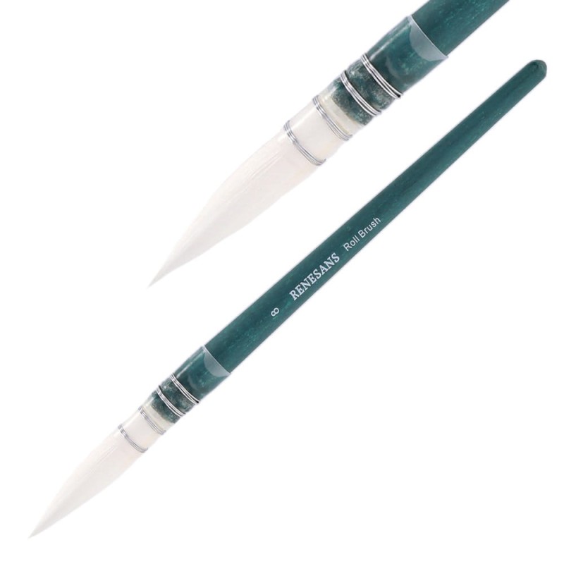 Roll Brush posiada białe, okrągłe, nylonowe włosie typu MOP. Jest miękkie i sprężyste co sprawia, że bardzo dobrze nadaje się do farb akwarelowych. Magazynują duże ilości farby, pozwalając na malowanie precyzyjnych linii. Trzonki są krótkie, drewniane, barwione na turkusowo.