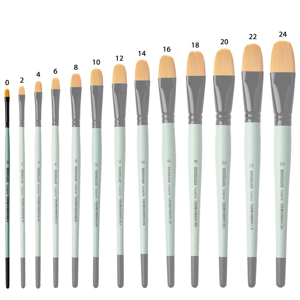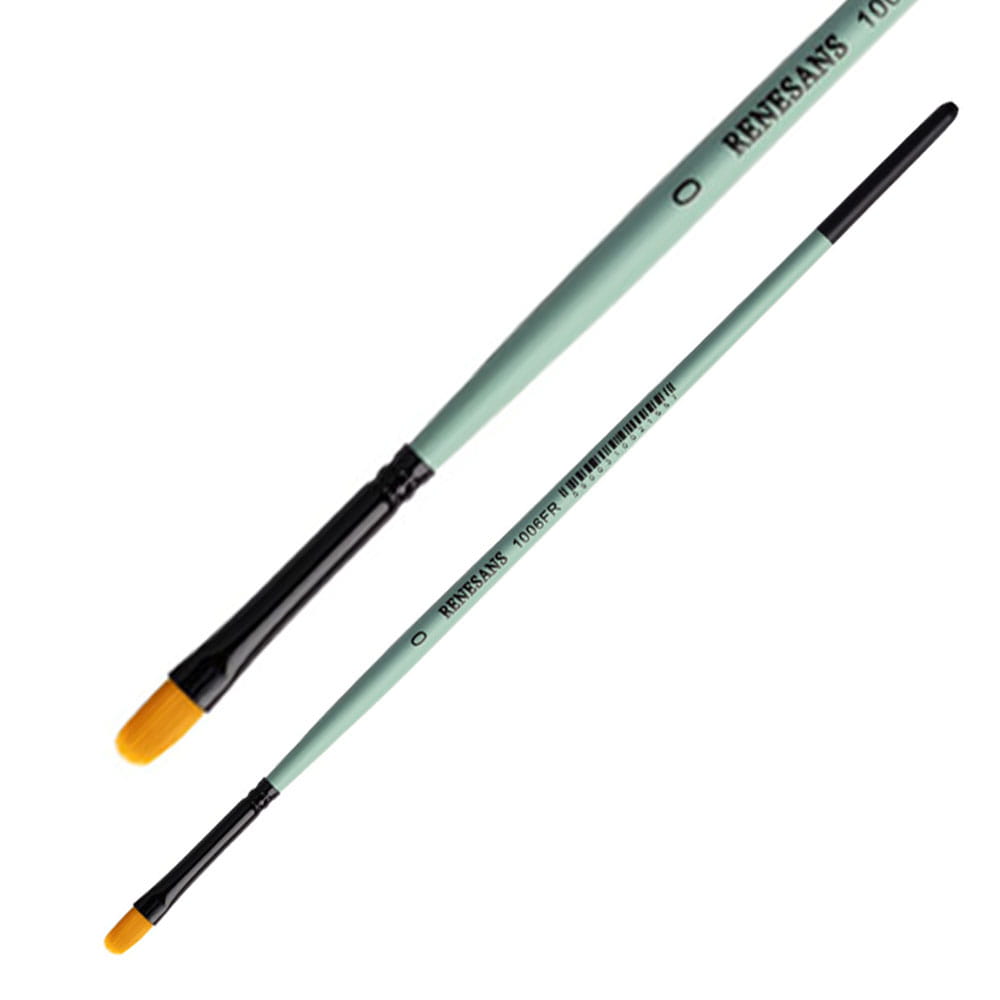 Seria 1006FR marki Renesans posiada syntetyczne pędzle, w kształcie kociego języka, z miękkim, złotym włosiem oraz krótką, zieloną rączką i metalową skuwką.