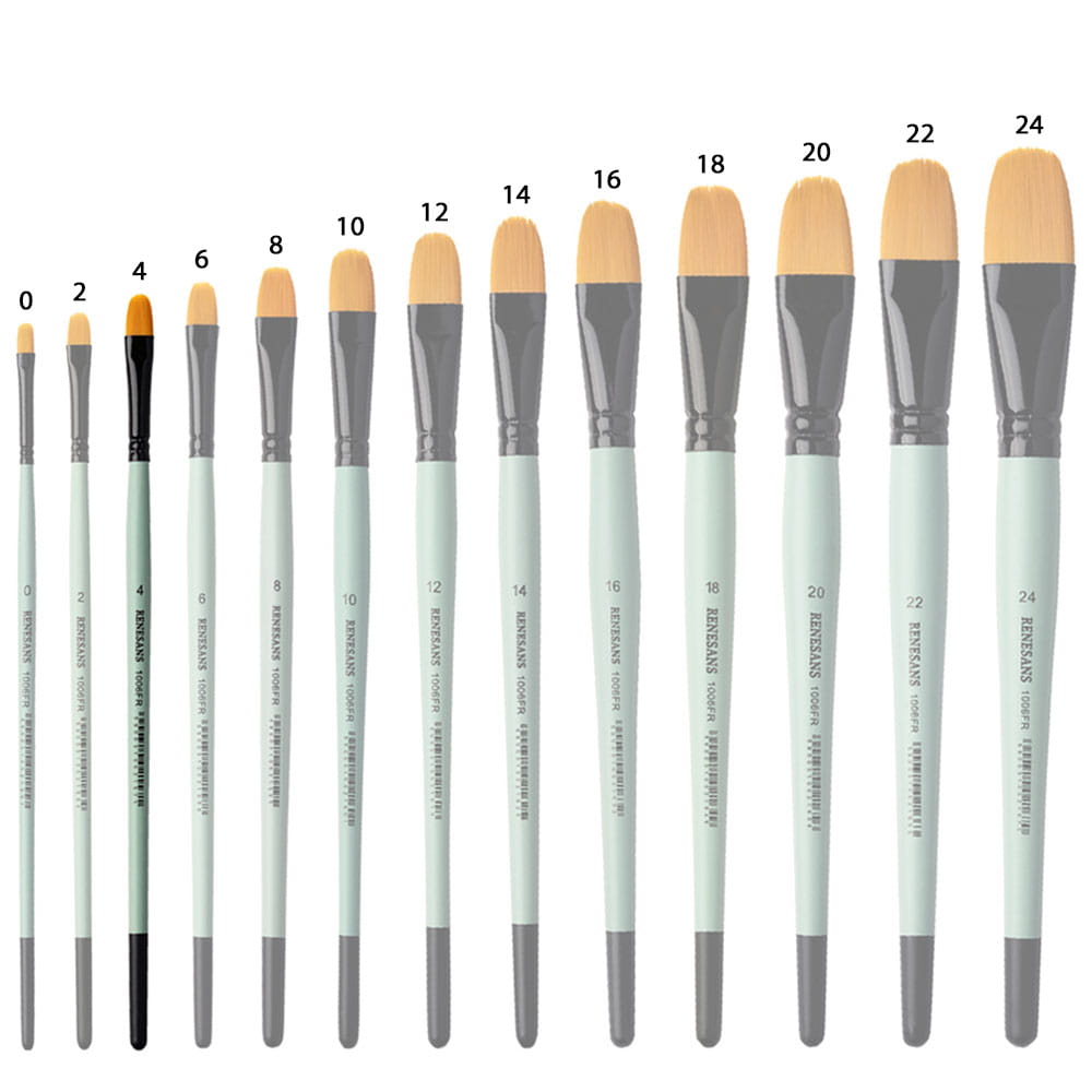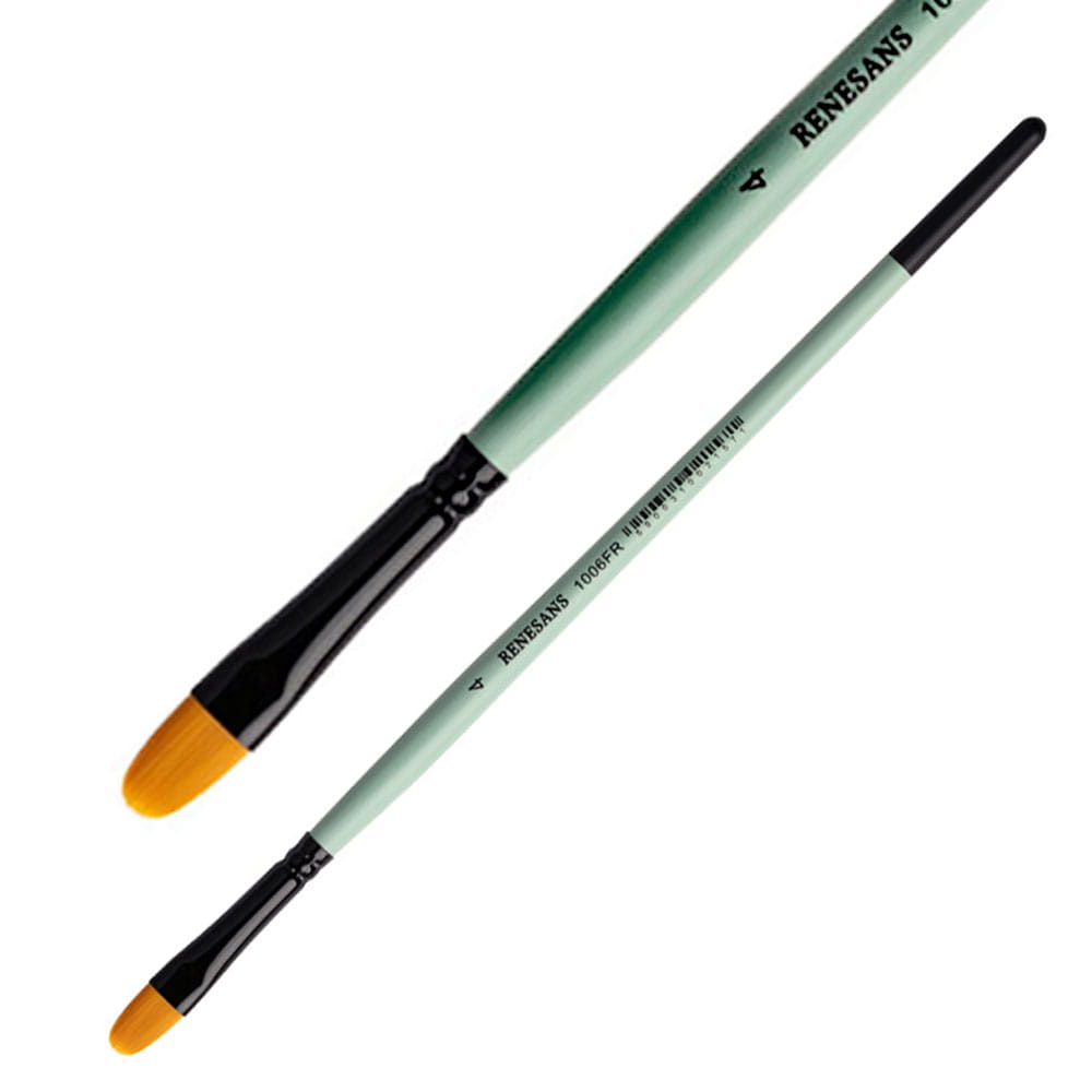 Seria 1006FR marki Renesans posiada syntetyczne pędzle, w kształcie kociego języka, z miękkim, złotym włosiem oraz krótką, zieloną rączką i metalową skuwką.