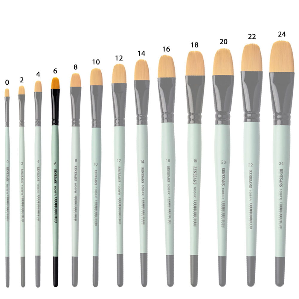 Seria 1006FR marki Renesans posiada syntetyczne pędzle, w kształcie kociego języka, z miękkim, złotym włosiem oraz krótką, zieloną rączką i metalową skuwką.