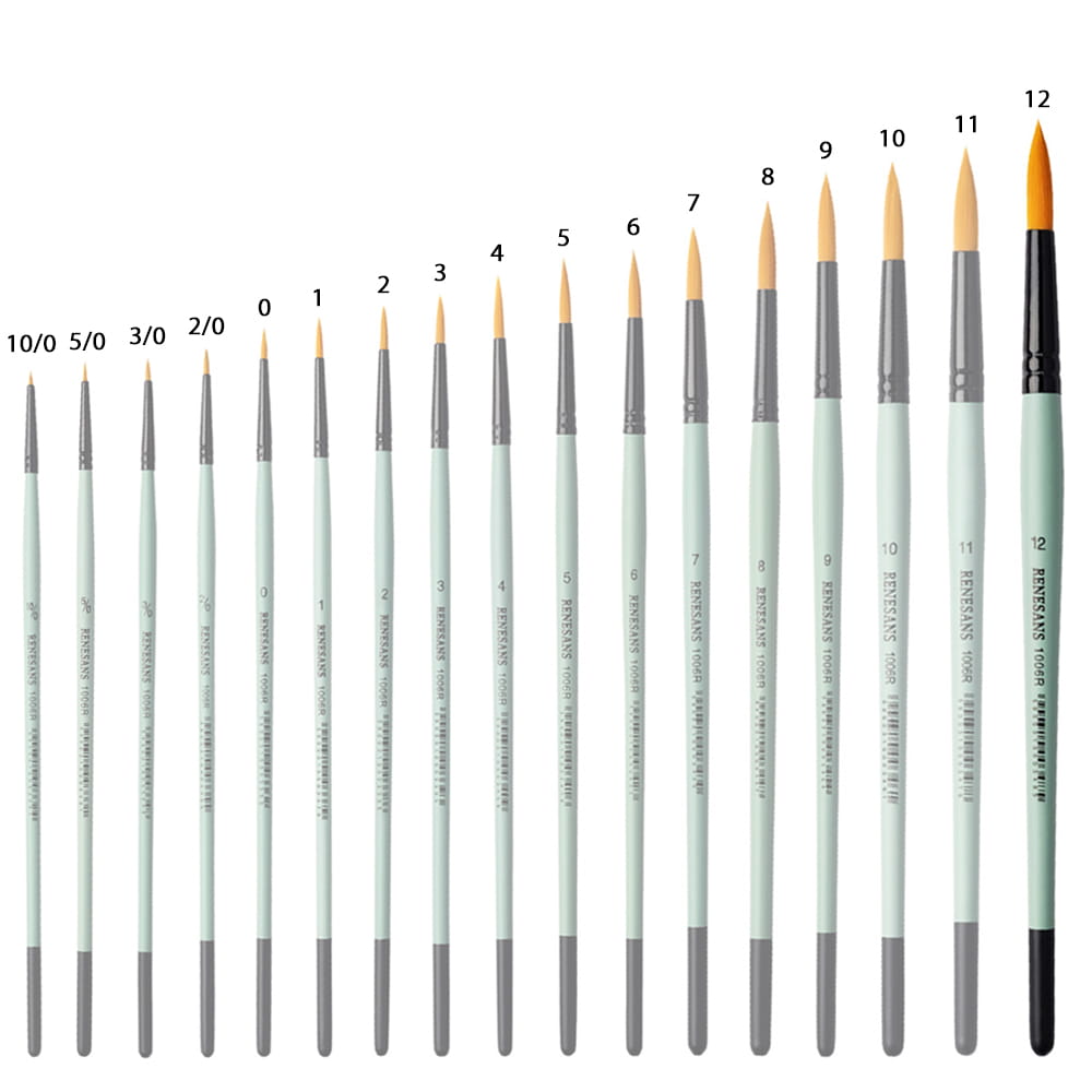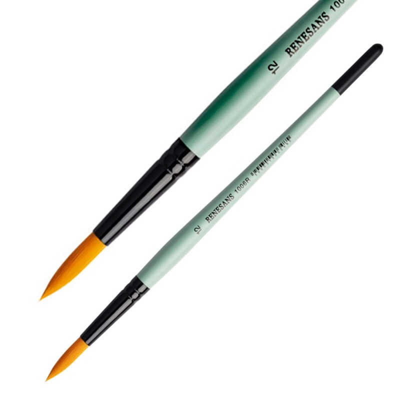 Seria 1006R marki Renesans posiada okrągłe, syntetyczne pędzle z miękkim, złotym włosiem oraz krótką, zieloną rączką i metalową skuwką.