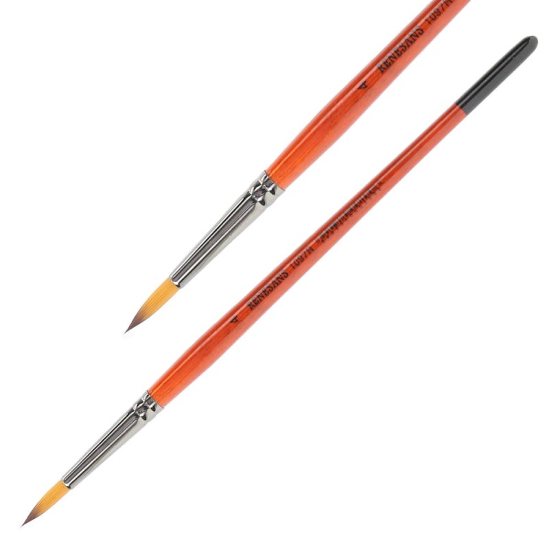 Seria 1097R to okrągłe pędzle ze szpicem wykonane z miękkiego, sprężystego włosia syntetycznego w złoto - brązowym kolorze. Posiadają krótki, lakierowany trzonek w pomarańczowym kolorze. Polecane zarówno do farb wodnych jak i olejnych.