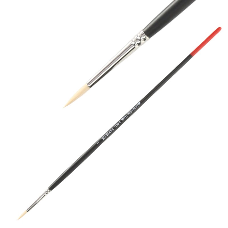 Pędzle 1108R to seria wysokiej jakości pędzli okrągłych ze szpicem z syntetycznej szczeciny, osadzonej w malowanej na czarno, nielakierowanej rączce. Przeznaczone szczególnie do farb olejnych ze względu na twarde i grube włosie, pozostawiające ślad pędzla.
