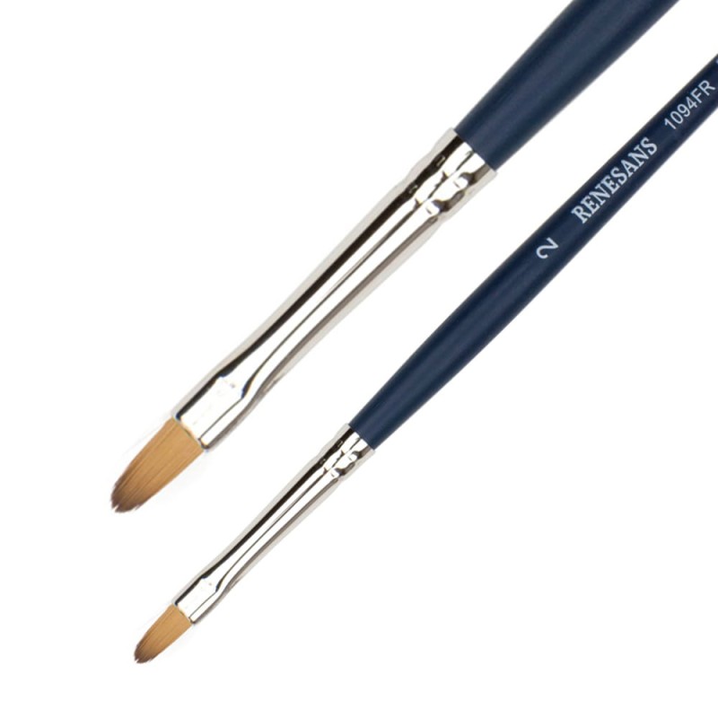 Seria 1094FR marki Renesans posiada syntetyczne pędzle imitujące naturalne włosie kun, w kształcie kociego języka. Jest bardzo miękkie, chłonne i odporne. Seria cechuje się krótką, drewnianą rączką w kolorze granatowym. Przeznaczone do akwareli, akryli lub laserunkowego malarstwa olejnego.