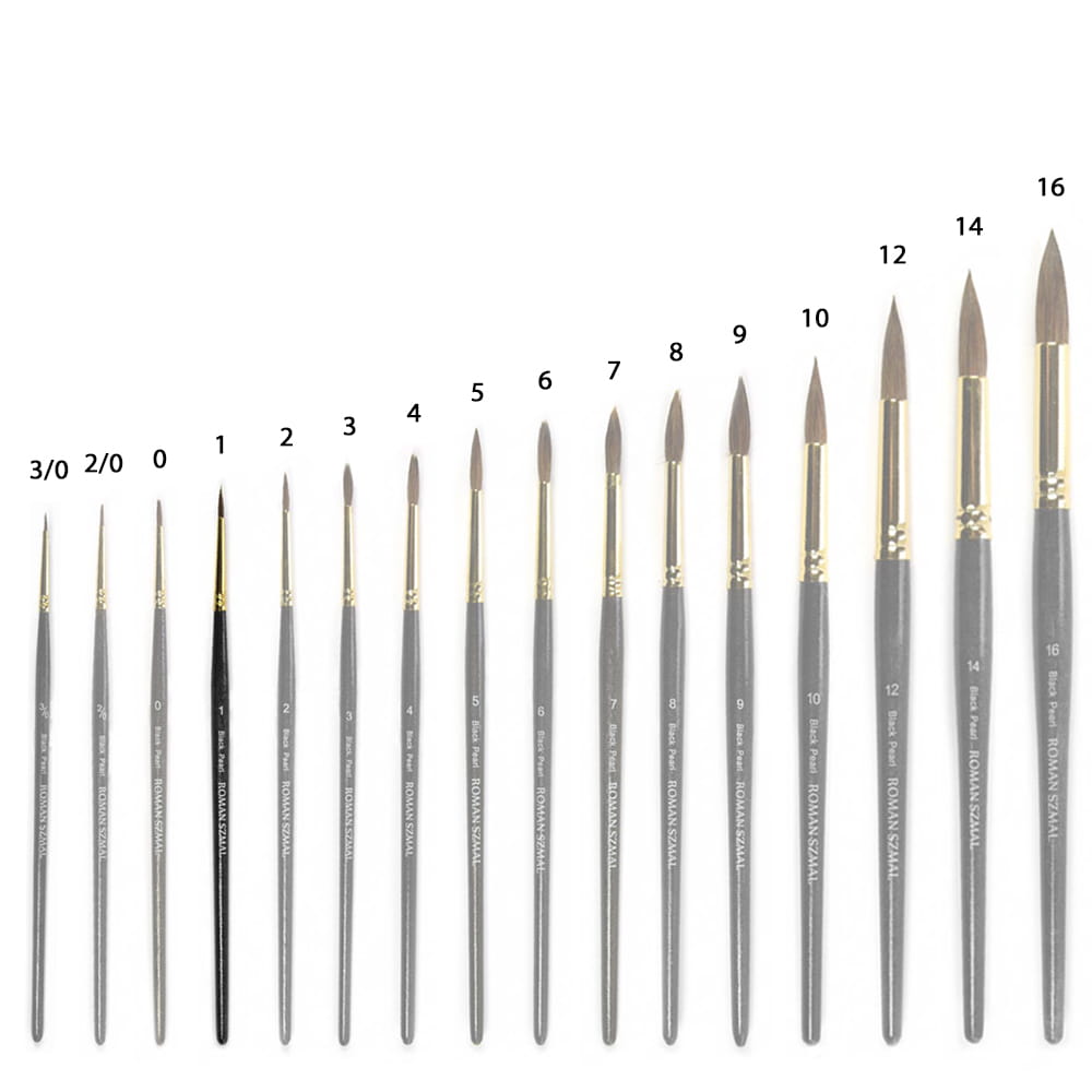 Okrągłe pędzle z serii Black Pearl marki Roman Szmal cechują mieszanką włosia syntetycznego z naturalnym, co pozwoliło uzyskać właściwości włosia wiewiórki, które doskonale chłonie wodę i dobrze przenosi pigment farb na papier. Krótki drewniany trzonek pokryto czarnym lakierem z połyskującymi drobinkami, a bezszwowa skuwka w kolorze złotym wykonana została z niklu. Pędzle w szczególności dedykowane do farb akwarelowych i wodnych.