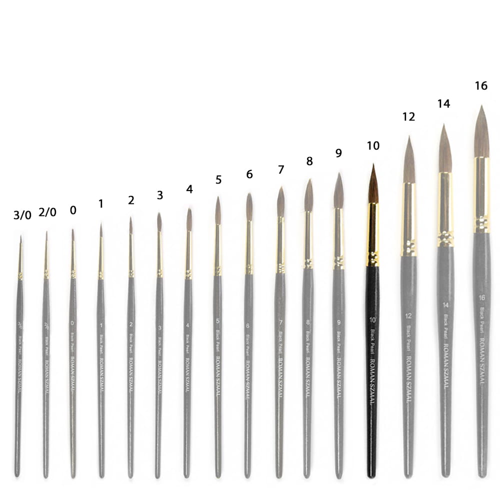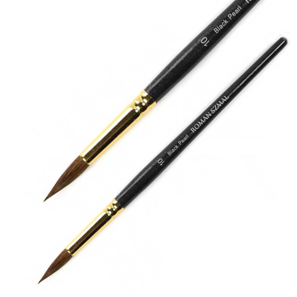 Okrągłe pędzle z serii Black Pearl marki Roman Szmal cechują mieszanką włosia syntetycznego z naturalnym, co pozwoliło uzyskać właściwości włosia wiewiórki, które doskonale chłonie wodę i dobrze przenosi pigment farb na papier. Krótki drewniany trzonek pokryto czarnym lakierem z połyskującymi drobinkami, a bezszwowa skuwka w kolorze złotym wykonana została z niklu. Pędzle w szczególności dedykowane do farb akwarelowych i wodnych.