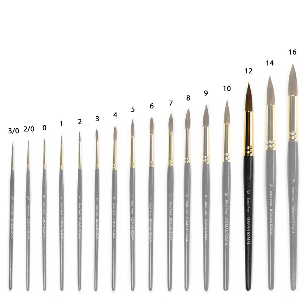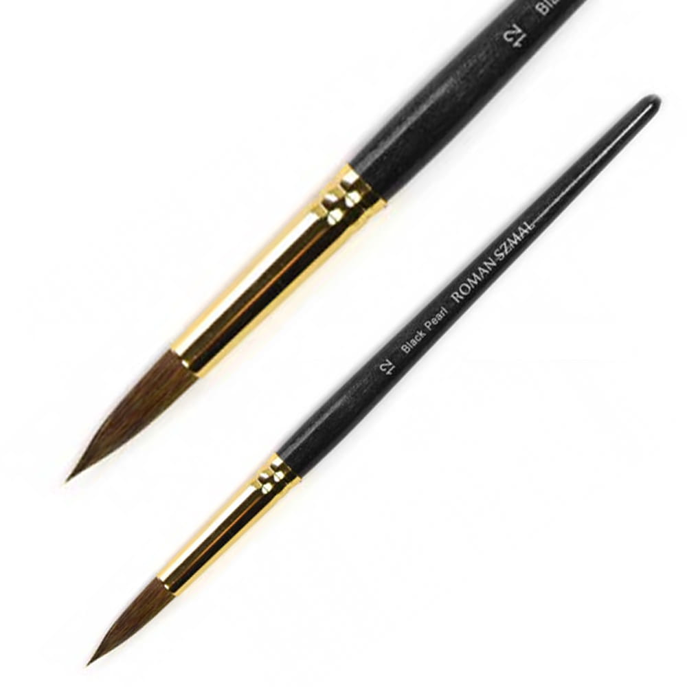 Okrągłe pędzle z serii Black Pearl marki Roman Szmal cechują mieszanką włosia syntetycznego z naturalnym, co pozwoliło uzyskać właściwości włosia wiewiórki, które doskonale chłonie wodę i dobrze przenosi pigment farb na papier. Krótki drewniany trzonek pokryto czarnym lakierem z połyskującymi drobinkami, a bezszwowa skuwka w kolorze złotym wykonana została z niklu. Pędzle w szczególności dedykowane do farb akwarelowych i wodnych.