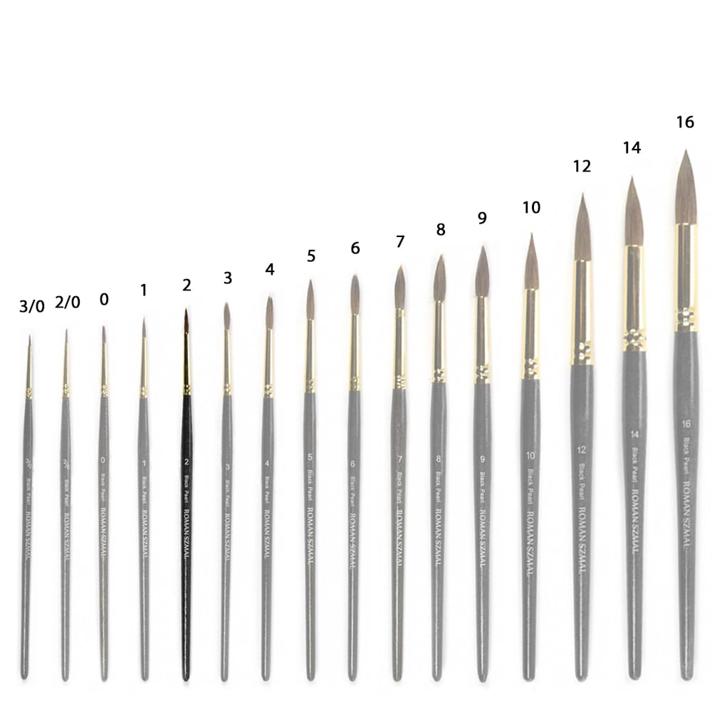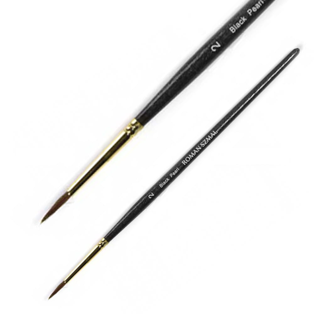 Okrągłe pędzle z serii Black Pearl marki Roman Szmal cechują mieszanką włosia syntetycznego z naturalnym, co pozwoliło uzyskać właściwości włosia wiewiórki, które doskonale chłonie wodę i dobrze przenosi pigment farb na papier. Krótki drewniany trzonek pokryto czarnym lakierem z połyskującymi drobinkami, a bezszwowa skuwka w kolorze złotym wykonana została z niklu. Pędzle w szczególności dedykowane do farb akwarelowych i wodnych.