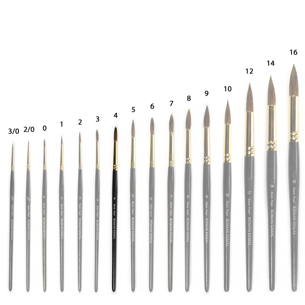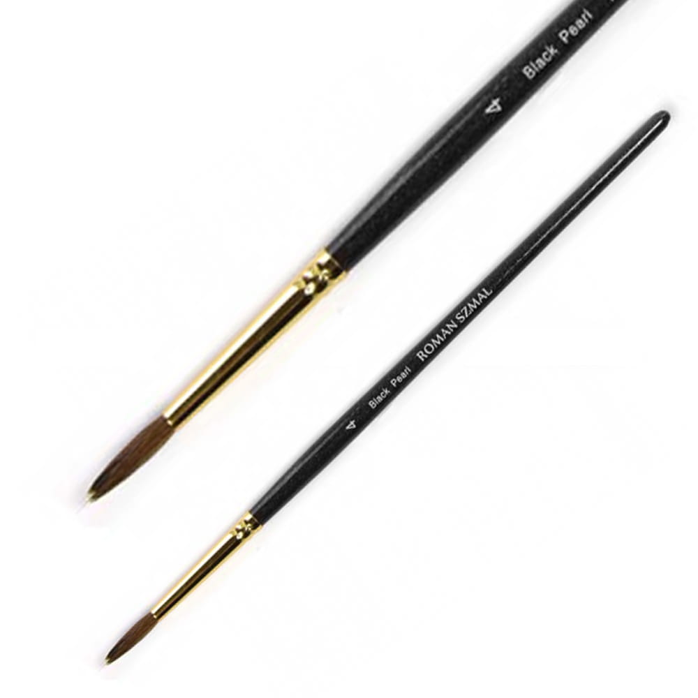 Okrągłe pędzle z serii Black Pearl marki Roman Szmal cechują mieszanką włosia syntetycznego z naturalnym, co pozwoliło uzyskać właściwości włosia wiewiórki, które doskonale chłonie wodę i dobrze przenosi pigment farb na papier. Krótki drewniany trzonek pokryto czarnym lakierem z połyskującymi drobinkami, a bezszwowa skuwka w kolorze złotym wykonana została z niklu. Pędzle w szczególności dedykowane do farb akwarelowych i wodnych.