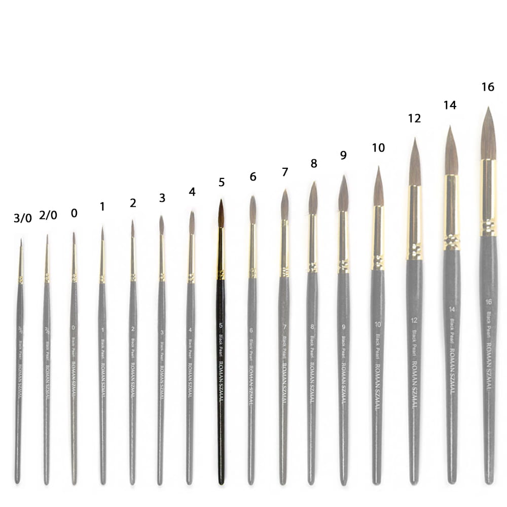 Okrągłe pędzle z serii Black Pearl marki Roman Szmal cechują mieszanką włosia syntetycznego z naturalnym, co pozwoliło uzyskać właściwości włosia wiewiórki, które doskonale chłonie wodę i dobrze przenosi pigment farb na papier. Krótki drewniany trzonek pokryto czarnym lakierem z połyskującymi drobinkami, a bezszwowa skuwka w kolorze złotym wykonana została z niklu. Pędzle w szczególności dedykowane do farb akwarelowych i wodnych.