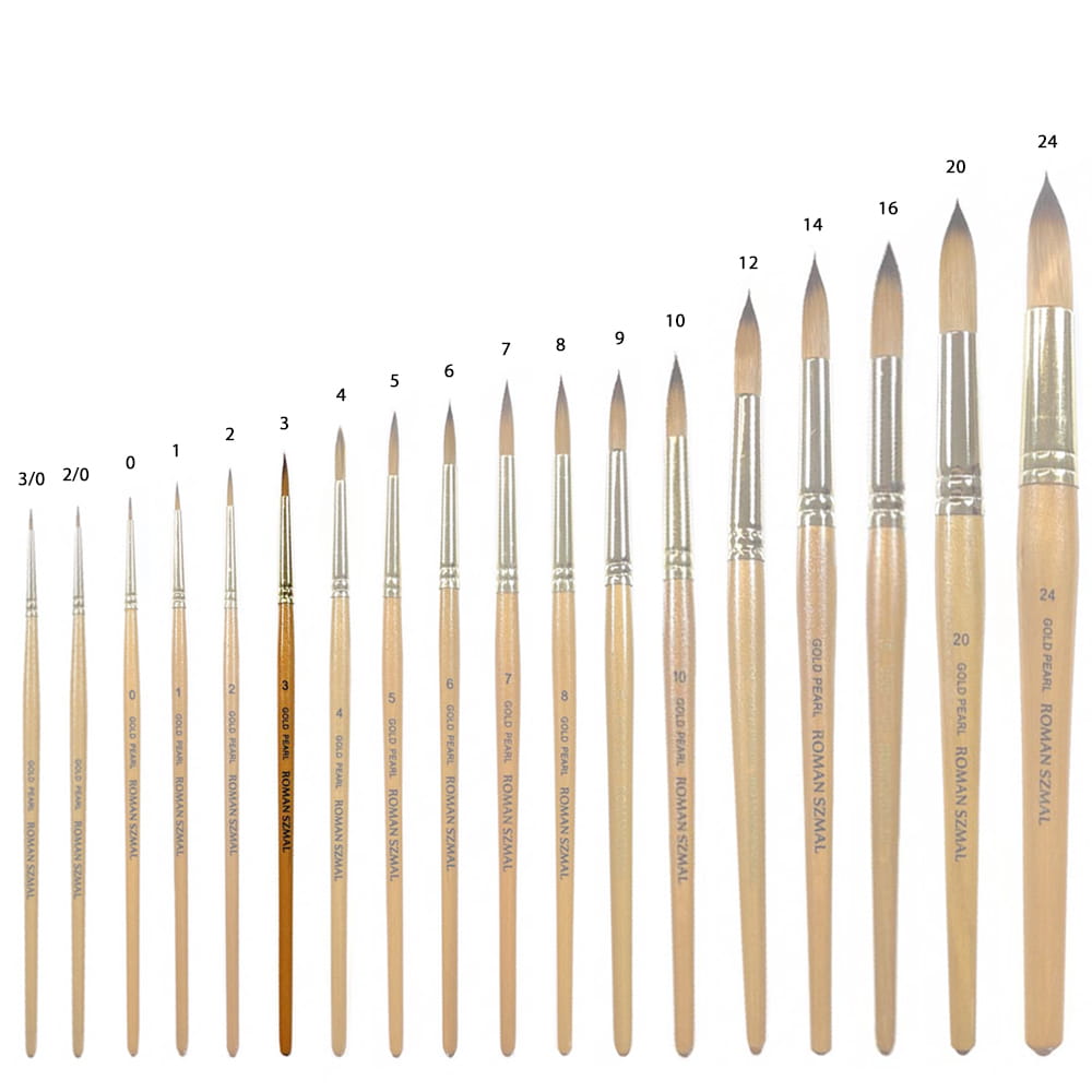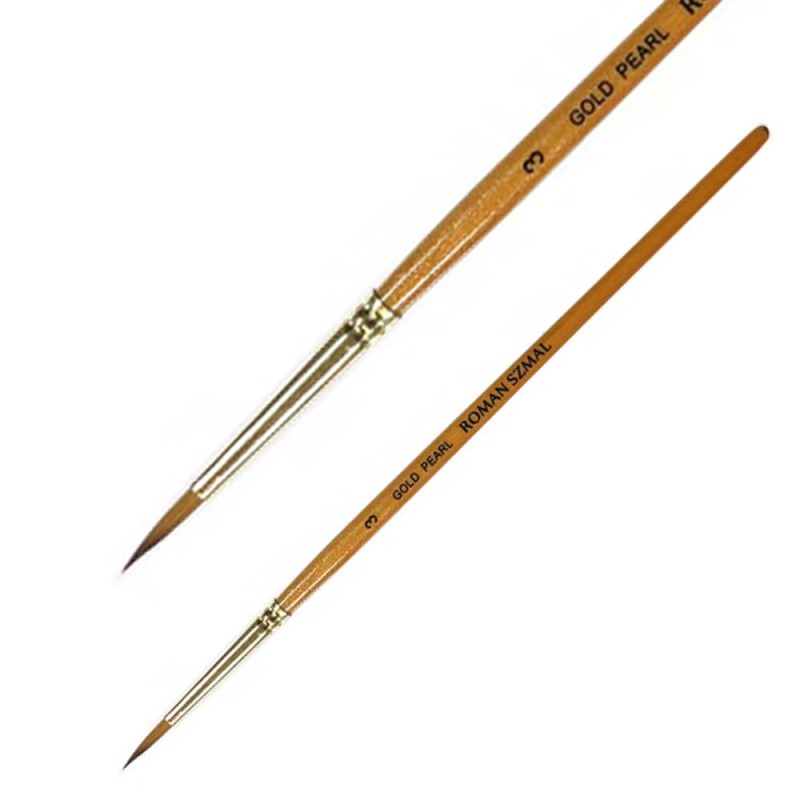Okrągłe pędzle z serii Gold Pearl marki Roman Szmal cechują się syntetycznym włosiem Toray (japońskiej produkcji) o właściwościach włosia sobolowego, które doskonale chłonie wodę i dobrze przenosi pigment farb na papier. Krótki drewniany trzonek pokryto bezbarwnym lakierem z drobinkami złota , a bezszwowa skuwka w kolorze złotym wykonana została z niklu. Pędzle w szczególności dedykowane do farb akwarelowych i wodnych.