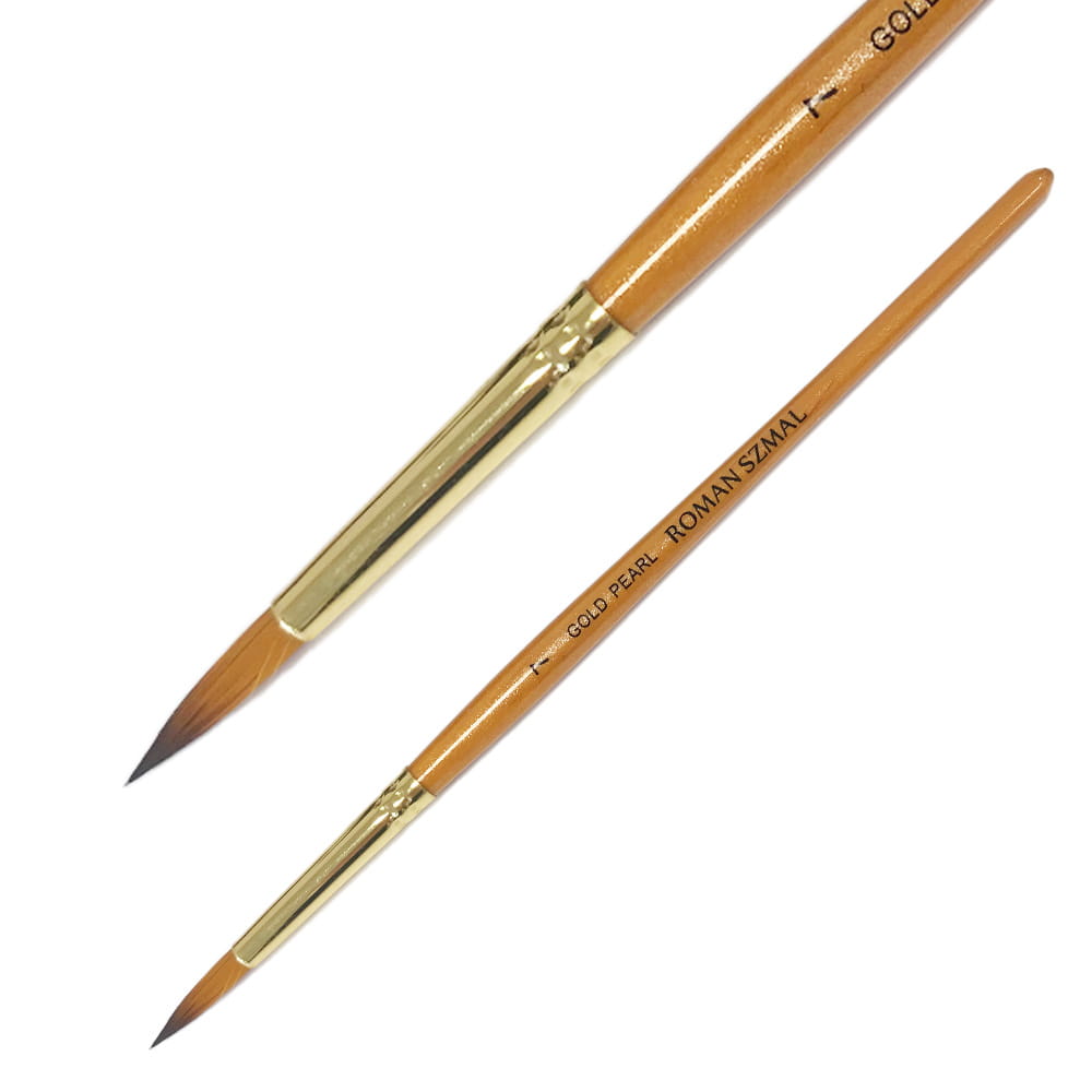 Okrągłe pędzle z serii Gold Pearl marki Roman Szmal cechują się syntetycznym włosiem Toray (japońskiej produkcji) o właściwościach włosia sobolowego, które doskonale chłonie wodę i dobrze przenosi pigment farb na papier. Krótki drewniany trzonek pokryto bezbarwnym lakierem z drobinkami złota , a bezszwowa skuwka w kolorze złotym wykonana została z niklu. Pędzle w szczególności dedykowane do farb akwarelowych i wodnych.
