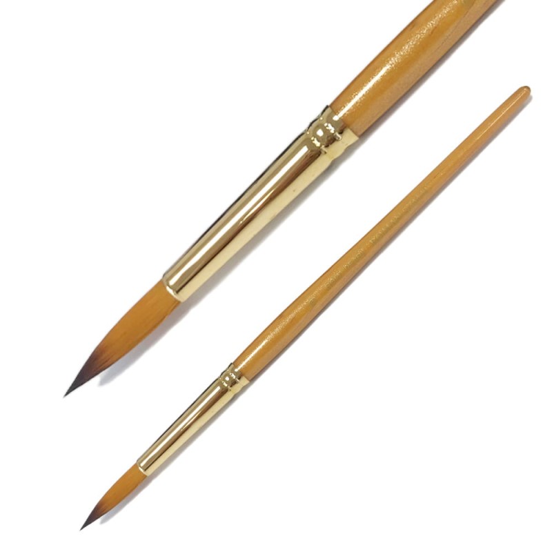 Okrągłe pędzle z serii Gold Pearl marki Roman Szmal cechują się syntetycznym włosiem Toray (japońskiej produkcji) o właściwościach włosia sobolowego, które doskonale chłonie wodę i dobrze przenosi pigment farb na papier. Krótki drewniany trzonek pokryto bezbarwnym lakierem z drobinkami złota , a bezszwowa skuwka w kolorze złotym wykonana została z niklu. Pędzle w szczególności dedykowane do farb akwarelowych i wodnych.